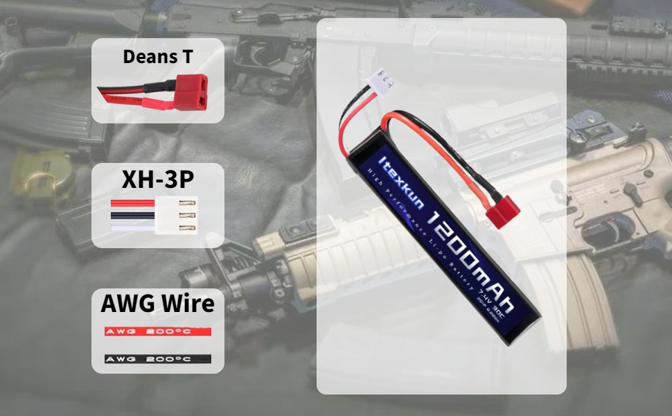 (Application) Itexkun 2S 1200mah li-on battery fits for airsoft like M4, AK47, AEG, MP5K, MP5, SCAR, M249, M60, G36, RPK, AUG(You can use it for other airsoft gun if the voltage dimension and the plug match)