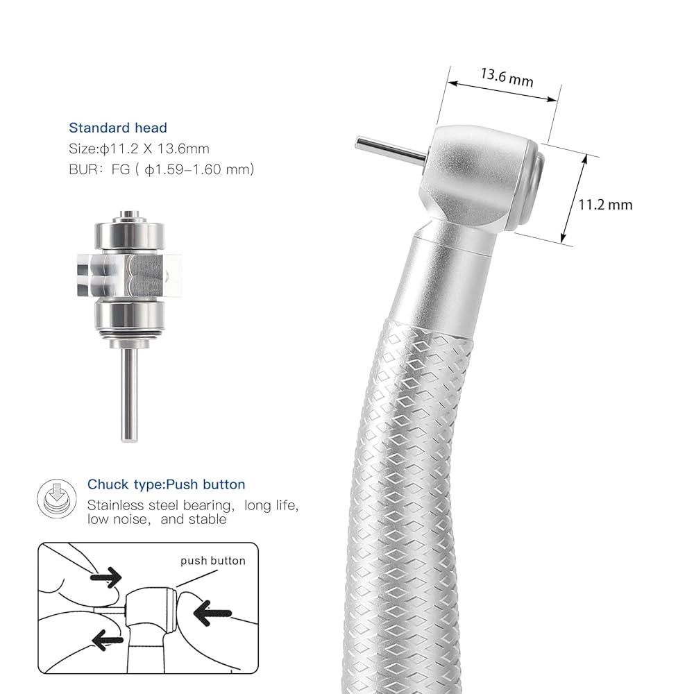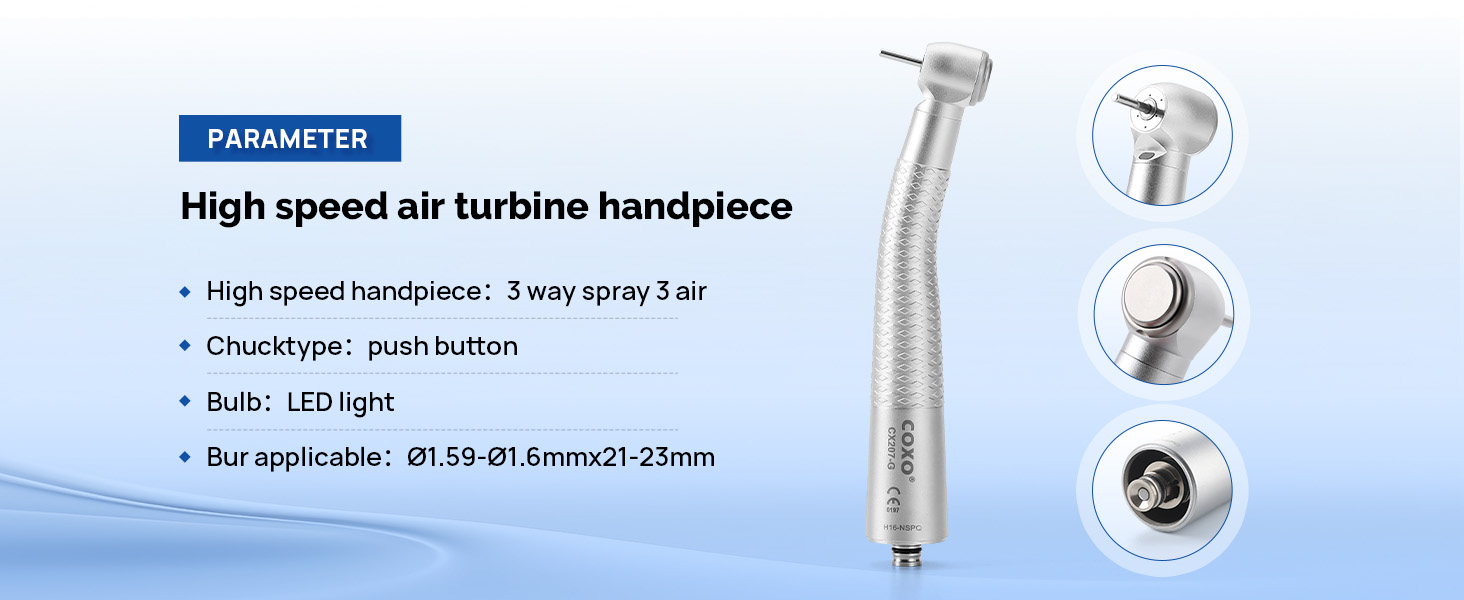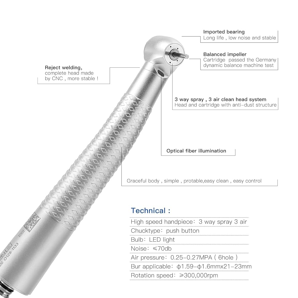 - Chuck type: push button;bulb: LED light;noise:≤70dB;air pressure: 0.25-0.28MPA(6hole);bur applicable: Ø1.59-Ø1.6mmx21-23mm;rotation speed: 300,000rpm;bulb power:1w;work voltage: 2.9v-3.2v;work current:160mA