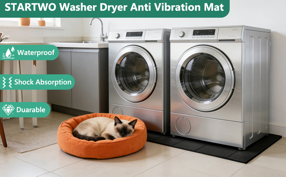 [High Quality Material]STARTWO Washing Machine and Dryer Anti-Vibration Pads feature a three-layer construction: - Waterproof faux leather layer (high-density PVC material with textured finish for easy cleaning) - Foam elastic layer (advanced foaming technology for softness, resilience, and strong rebound) - Shock-absorbing soundproofing layer (specialized acoustic material connecting PVC and foam layers)