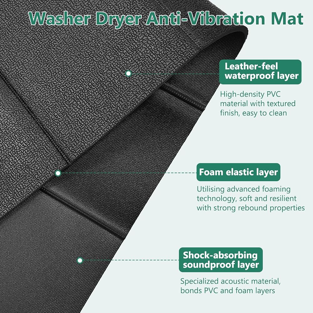 [Vibration Damping and Noise Reduction]This washer-dryer anti-vibration mat is crafted from 6mm thick rubber and high-density PVC, featuring a premium leather-like texture. You can do laundry anytime without worrying about disturbing others. Its triple-layer foam core provides powerful elasticity to absorb vibrations between appliances and floors, helping extend the lifespan of your appliances.