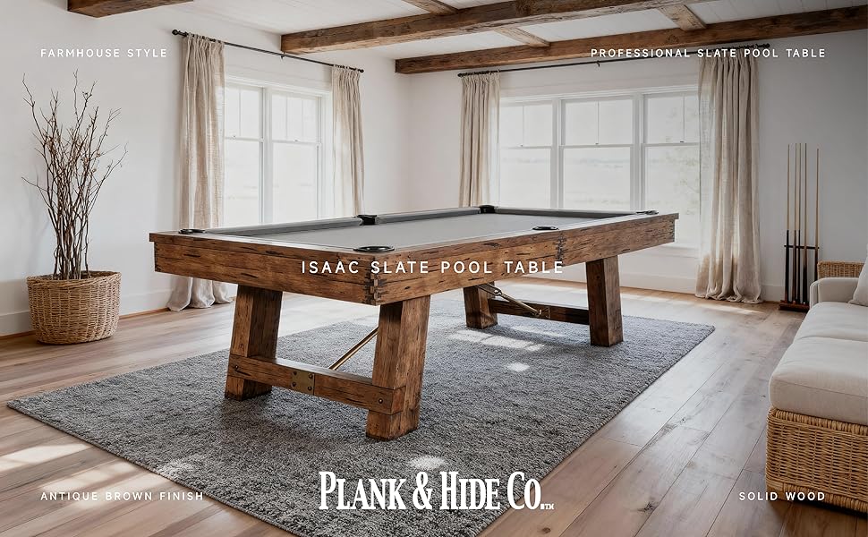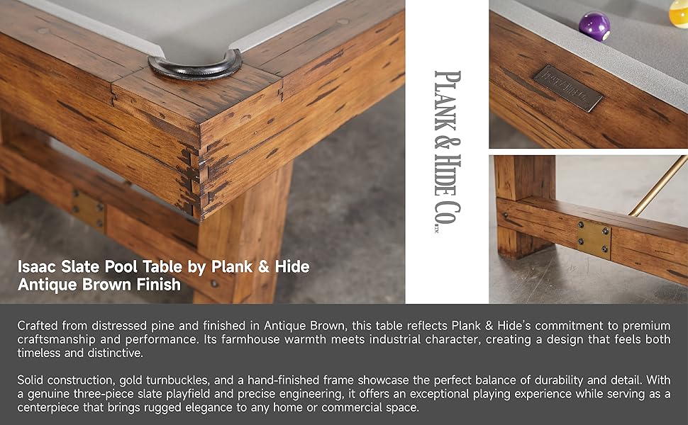Introducing the Isaac Slate Pool Table by Plank & Hide. This stunning collaboration merges the best of two design worlds—Sawyer Twain's renowned ability to curate luxury, high-performance game room furniture and Plank & Hide's dedication to premium craftsmanship. With its Distressed Brown & Gold finish and exquisite attention to detail, this limited-edition table is a unique and exclusive offering for discerning customers who demand both style and function in their home or commercial space.