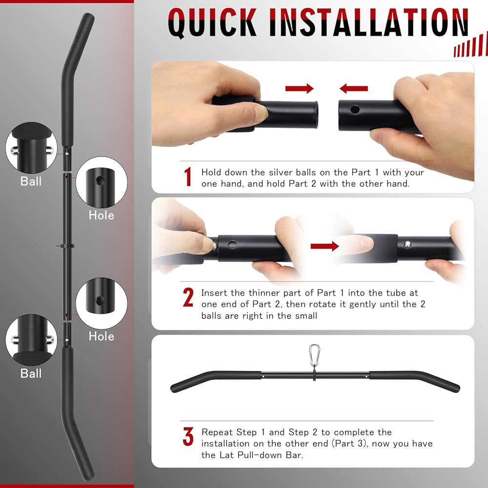 360° Rotation & Compact Storage-With its 360-rotating design, the lat pulldown bar attachment reduces friction to the fullest, enhancing your exercise effectiveness. What's more, it's split into three components for space-saving storage, and when assembled, the parts connect tightly without any shaking. Every tool needed for installation is provided in the box