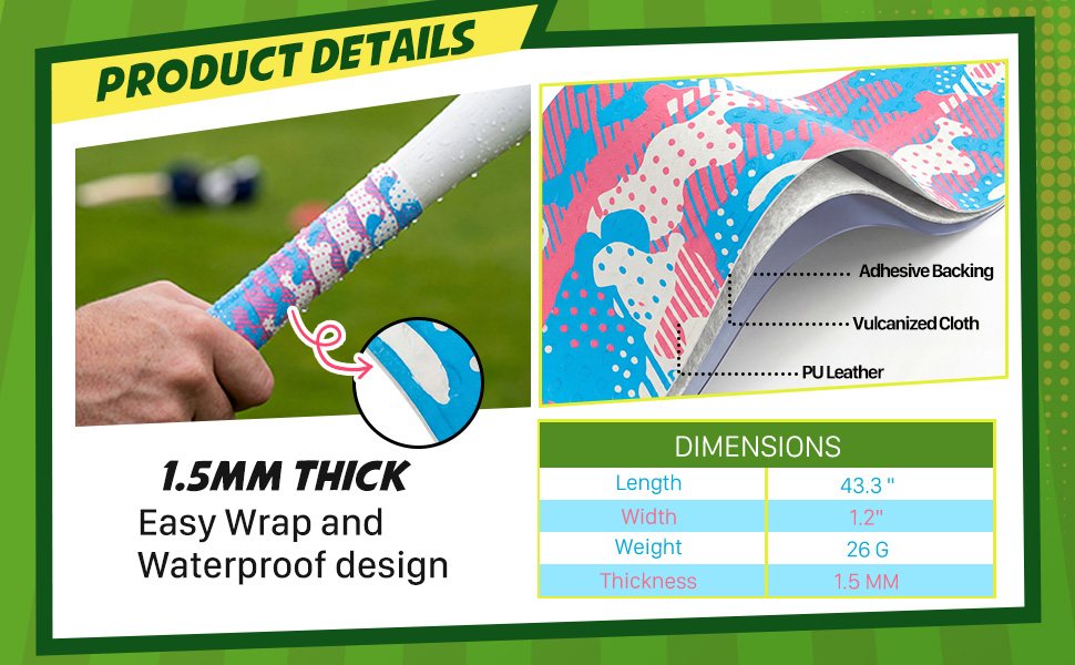 1.5 Mm Cushioned Feel: designed with 1.5 mm thickness, the bat grip tape provides exceptional shock absorption and a secure hold; And the baseball grip tape for bats is about 3 cm/ 1.18 inches in width, about 110 cm/ 43.31 inches in length, suitable for many sports bat grips; Improves comfort and helps minimize hand fatigue during long games or practices