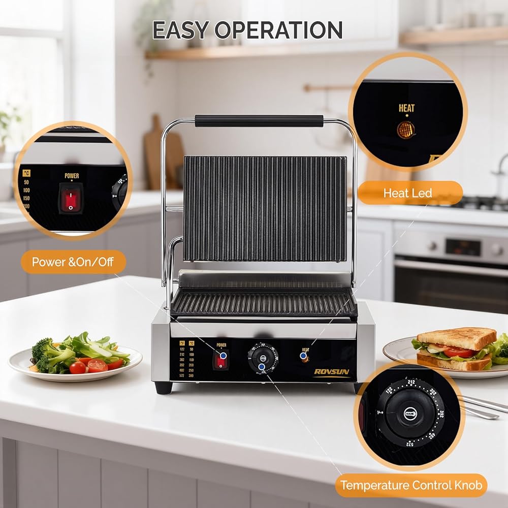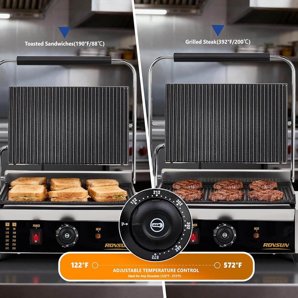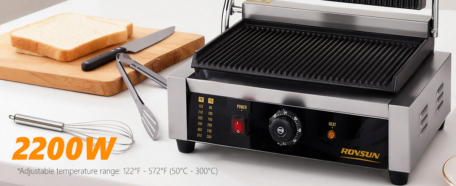 Wide Adjustable Temperature with LED Indicator: Take full control of your cooking with the precise thermostatic control knob, offering a wide temperature range from 122°F to 572°F (50°C to 300°C). The intuitive LED indicator light takes the guesswork out of cooking, showing when the grill is preheated and ready to use, ensuring perfect results for everything from delicate sandwiches to sizzling steaks.