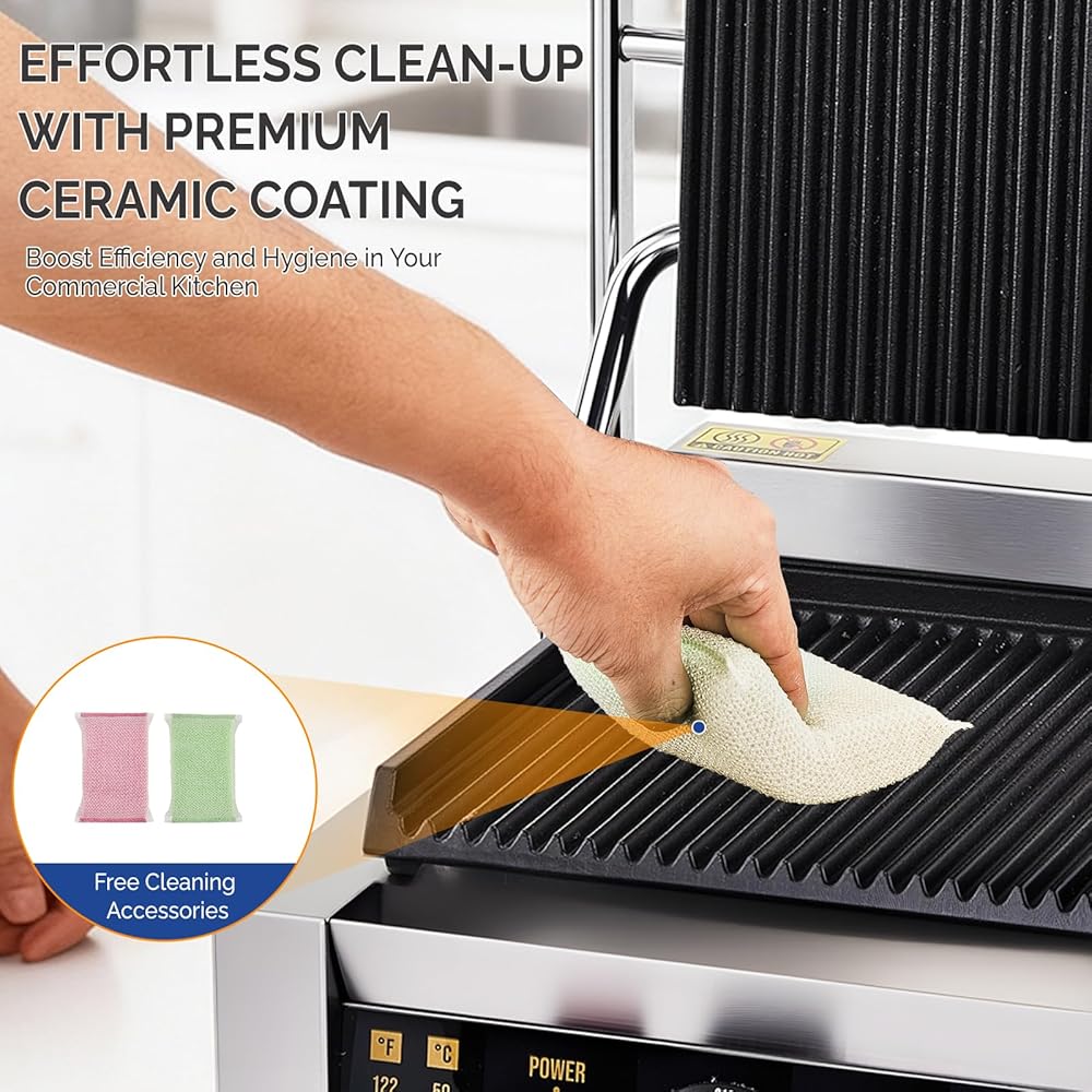 Durable & Easy to Clean: Constructed with a stainless steel housing and durable cast iron plates, this grill is built to last. The premium ceramic coating efficiently blocks excess oil and food residues, making cleanup a breeze. It comes included with free cleaning brushes and dishcloths for your convenience.