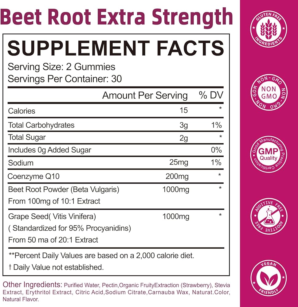 【Naturally Enhance Your Heart and Vascular Health】:Your body deserves the best defense. Our unique blend of 1000mg beetroot and 1000mg grape seed extract forms your daily shield for cardiovascular wellness. Beetroot is renowned for supporting healthy nitric oxide levels and promoting smooth blood flow, while the proanthocyanidins in grape seed extract deliver powerful antioxidant protection for your vascular tissues. Reward your heart with every delicious gummy.
