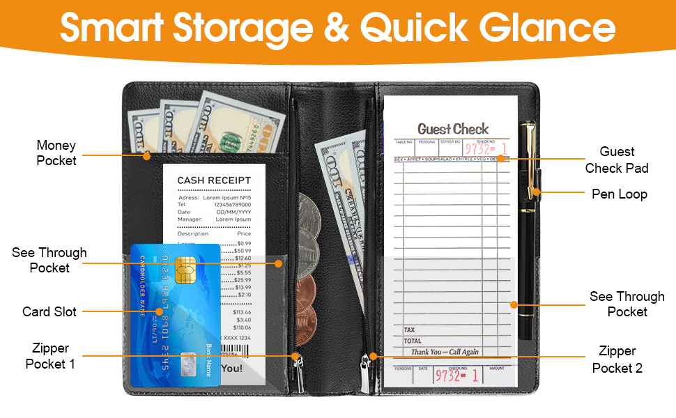 Multi-functional Compartment: The waitress book is designed with multi-functional compartments, which can store bills, receipts, coupons, credit cards, cash and other commonly used items, keeping items in order and convenient to take