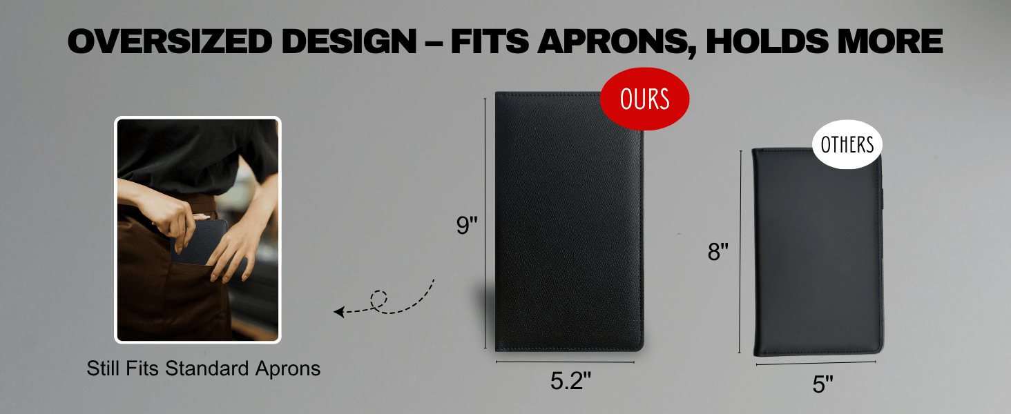 Oversized Design – Fits Aprons, Holds More: This server book is 5.2" × 9", bigger than most 5" × 8" waitress book. The larger size gives more space for checks, receipts, and cash, but is still slim enough to fit standard server aprons. A clear choice among server books for waitress