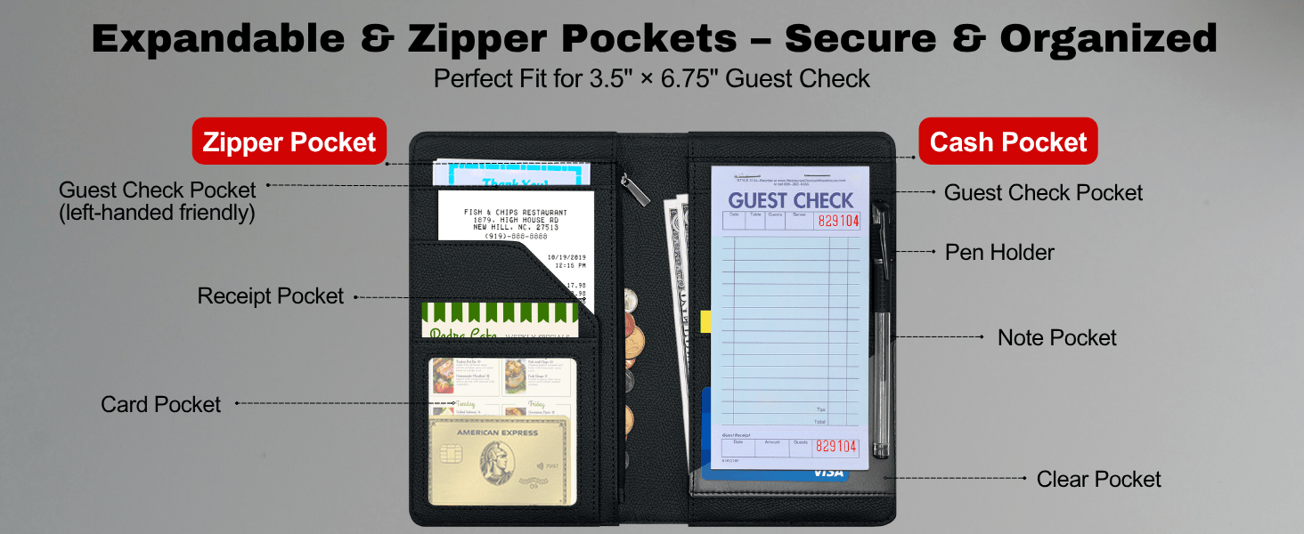 Made for Busy Shifts – Practical for Every Server: This servers book is built for daily use in restaurants, cafés, and bars. It keeps cash, tips, and receipts organized so servers can move faster and work easier. A cute server book design that looks professional, and a server book with zipper pocket that adds secure storage for busy shifts