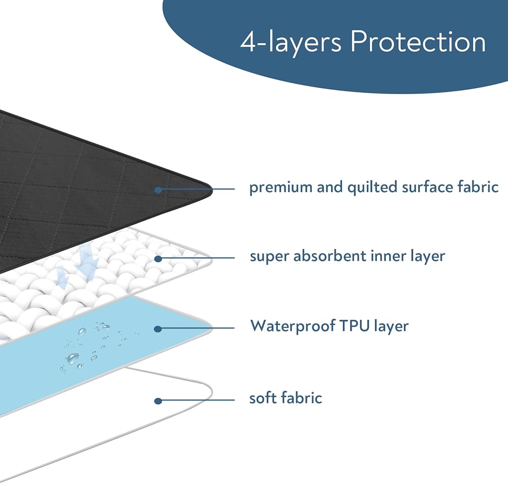 Four-Layers Protection: The waterproof incontinence bed pad measures 24" x 36", designed with 4 protective layers, which will keep your bed sheets dry and clean. Quilted surface layer uses breathable fabric, which will provide softness and comfort. And super absorbent layer can quickly absorb liquids, ensuring you a dry feeling.