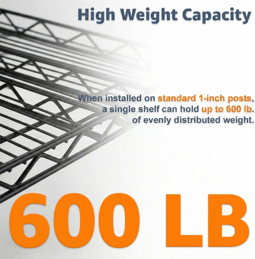 Each shelf is engineered to support up to 600 lb of evenly distributed weight, making them ideal for heavy-duty storage in commercial kitchens, restaurants, warehouses, stock rooms, retail environments, garages, and back-of-house areas. The commercial-grade construction delivers the strength and stability required for daily use in demanding workspaces.