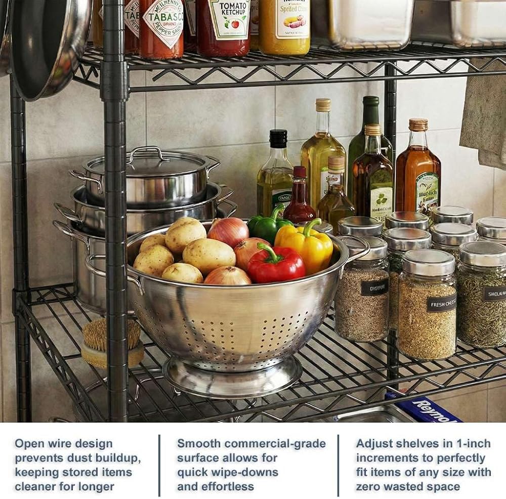 The open wire design enhances airflow around stored items, helping reduce dust accumulation and improving visibility and organization. This makes these shelves especially suitable for foodservice, inventory management, and professional storage applications where cleanliness and efficiency matter.