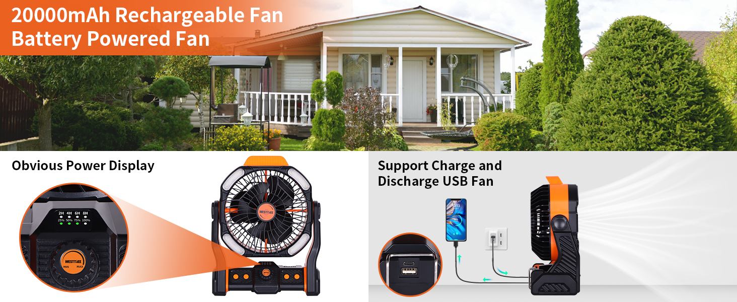 Portable fan Rechargeable battery Fan, beach fan powered by 20000mAh rechargeable battery powered fan, the camping fan can be fully charged in 6 hours with 5V3A input via the including type-C cord. Built-in type-C port and a USB output port for charging the fan conveniently, or use it as a power bank to power other devices, a good helper for camping trips, fishing, power outages, hurricanes, etc.