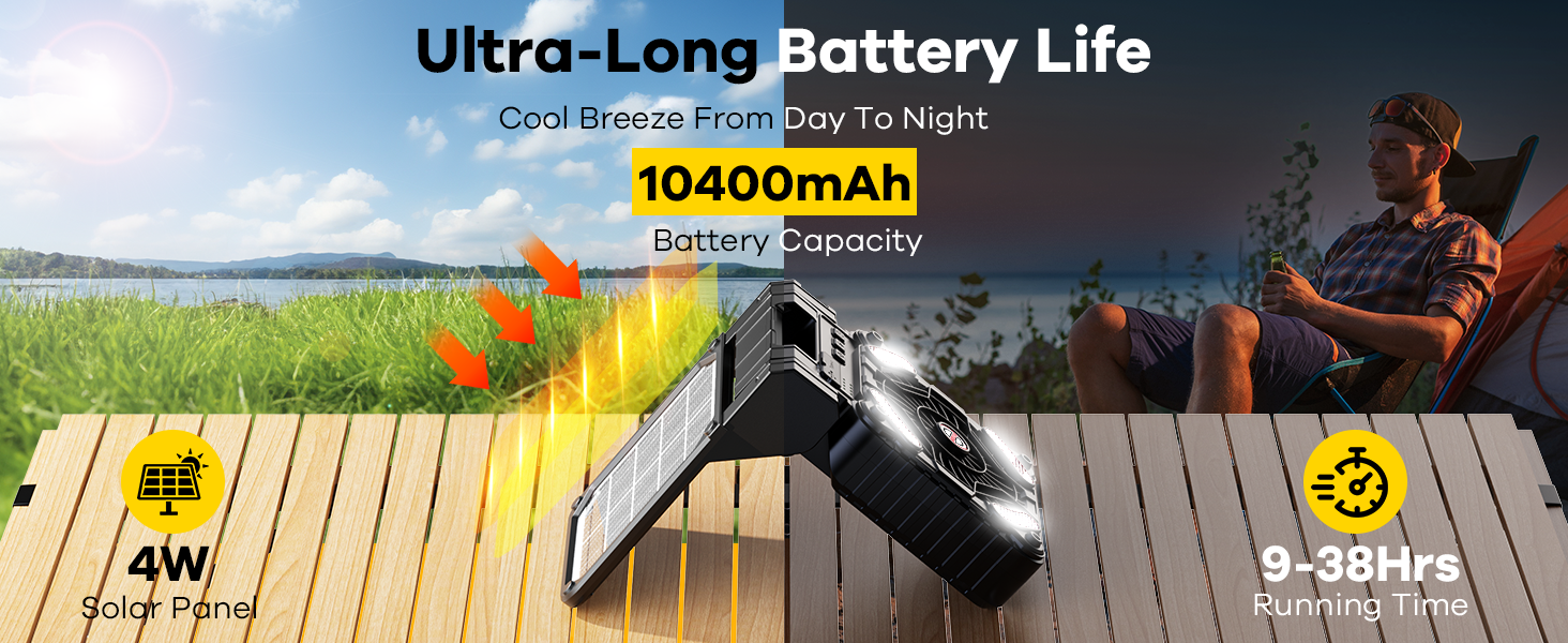 ☀️【Efficiency Solar Panel】- The solar panel is made of monocrystalline silicon and utilizes sunlight to generate electricity. It takes only 4 hours to fully charge the 10400mAh camping fan under bright light conditions. As a beach essential, Pack solar powered fan in travel accessories kits – worksites, vacations, or monsoons,it works perfectly anywhere.