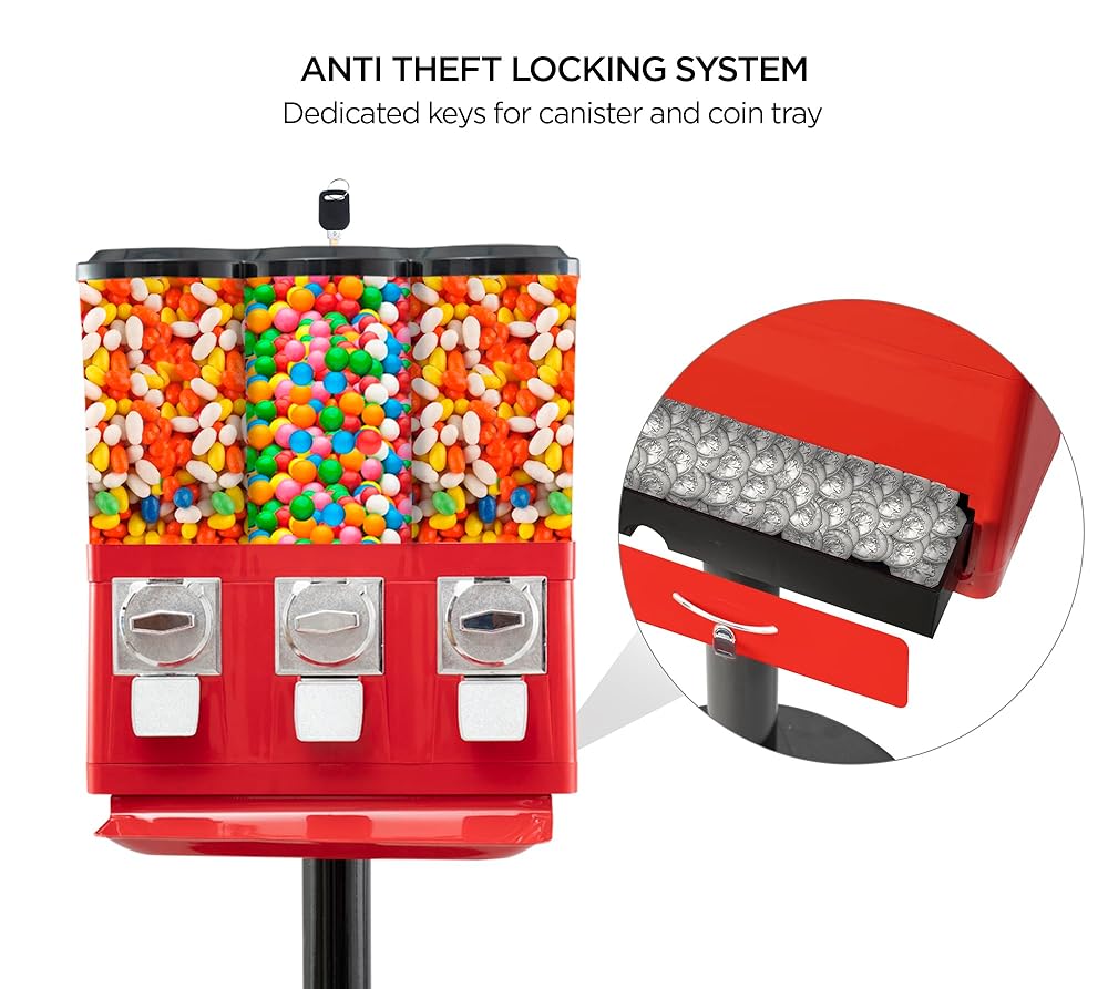 TRIPLE ADJUSTABLE CANISTERS. Upgraded coin mechanism, so it does not get struck. Coin operated candy dispenser comes with 1 gumball and 2 candy canisters. Can fit gumball of size up to 1 inch. Adjustable cannisters to control the portion of candies dispensed FOOD SAFE, EASY TO CLEAN Coin candy dispenser machine is made from SHATTERPROOF polystyrene and is food grade, MEETING FDA NORMS. The DETACHABLE canister design makes it easy to refill and clean ANTI THEFT LOCK TO SECURE COINS Commercial vending machine has 2 ANTI THEFT LOCKS to secure coins and candies. The coin mechanism accepts only quarter and is ALL METAL CONSTRUCTION unlike cheap vending machines made of plastic INCLUDES CANDY COLLECTION TRAY, SUNSHADE PLATE. Collection tray PREVENTS CANDY SPILLAGE and sunshade plate PREVENTS CANDIES FROM MELTING due to sun rays. Heavy cast iron all metal base to PREVENT FALLING OVER TOOL FREE EASY SET UP in 2 mins. Gumball vending machine comes with step by step instruction manual and doesn't need any tool to install. Align the key parallel to the side dimples on the lock to remove the key