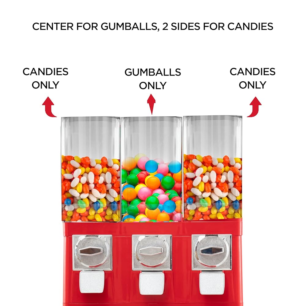 NOT A DEFECT, Some customers reported gumballs getting stuck when placed in the side dispensers. This happens because the center dispenser is for gumballs only (25–35mm round), while the side dispensers are for bulk candies. Using gumballs in the candy wheels, or candies in the gumball wheel, may cause them to get stuck. TRIPLE CANDY MACHINE DISPENSER with 1 gumball and 2 candy canisters. Can fit gumball of size upto 1 inch. Adjustable canisters to control portion of candies dispensed.
