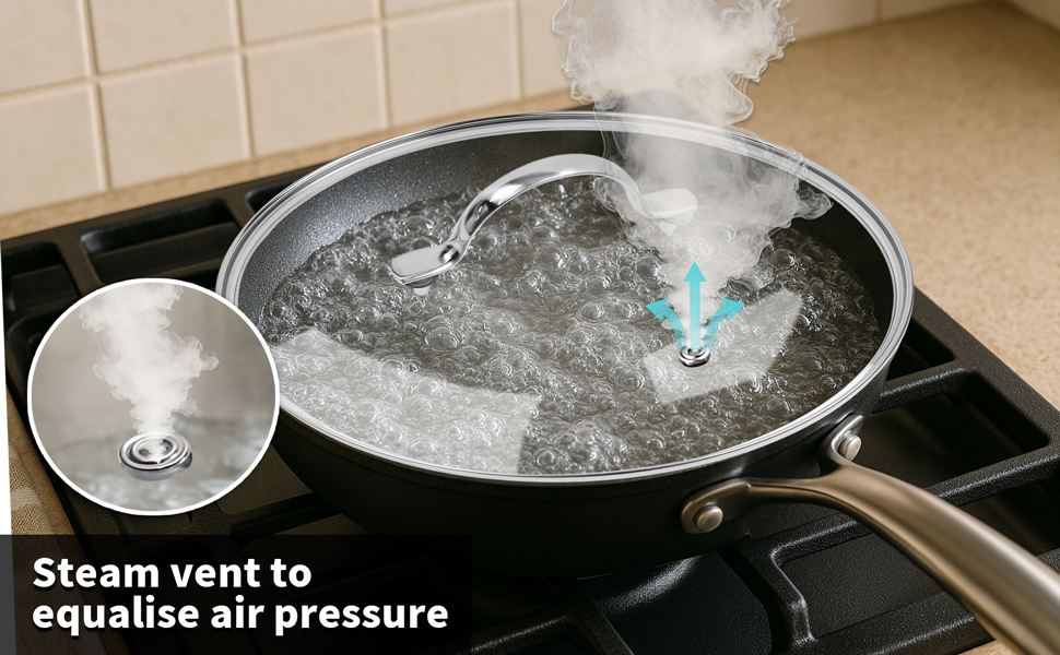Stainless Steel Frame: Tempered glass thickened to 4mm, resists cracking even if it falls from a height of 1.5 meters. The steel ring, exhaust hole and other metals are all food grade stainless steel, so you can use it with confidence.