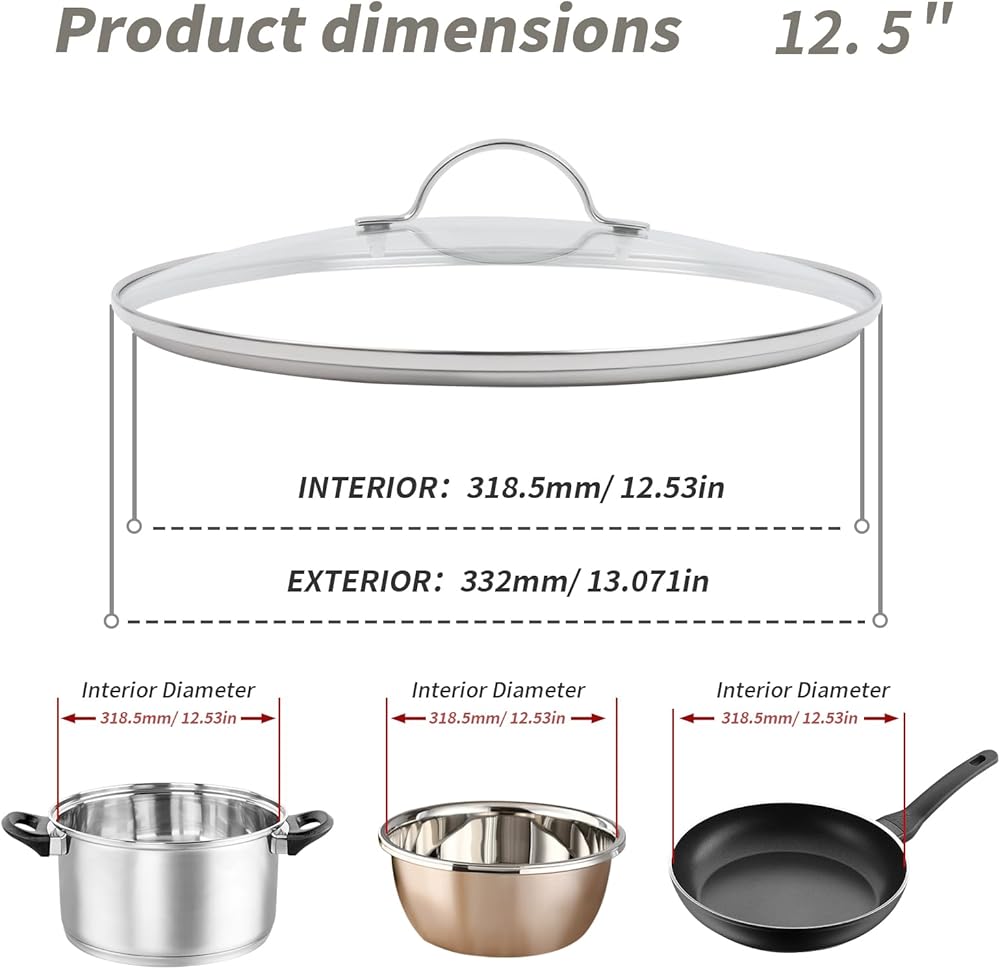 Useful Pot Lid: This 12.5" pan lid fits pots with an outer diameter less than 333mm and inner diameter greater than 319mm. Please carefully measure the outer and inner diameters of the pot and choose the correct size. The measurement method can be referred to the attached diagram.