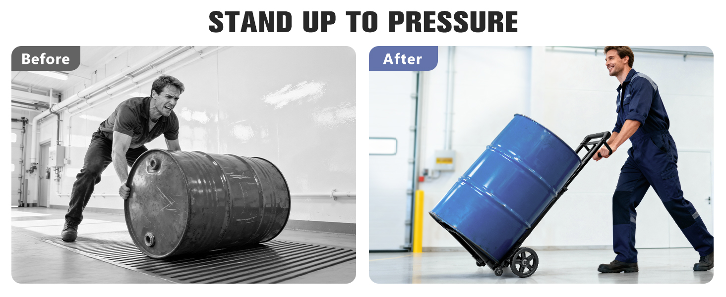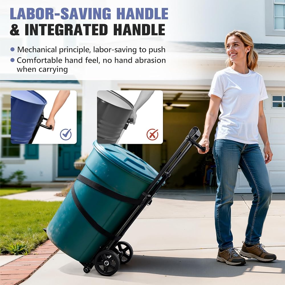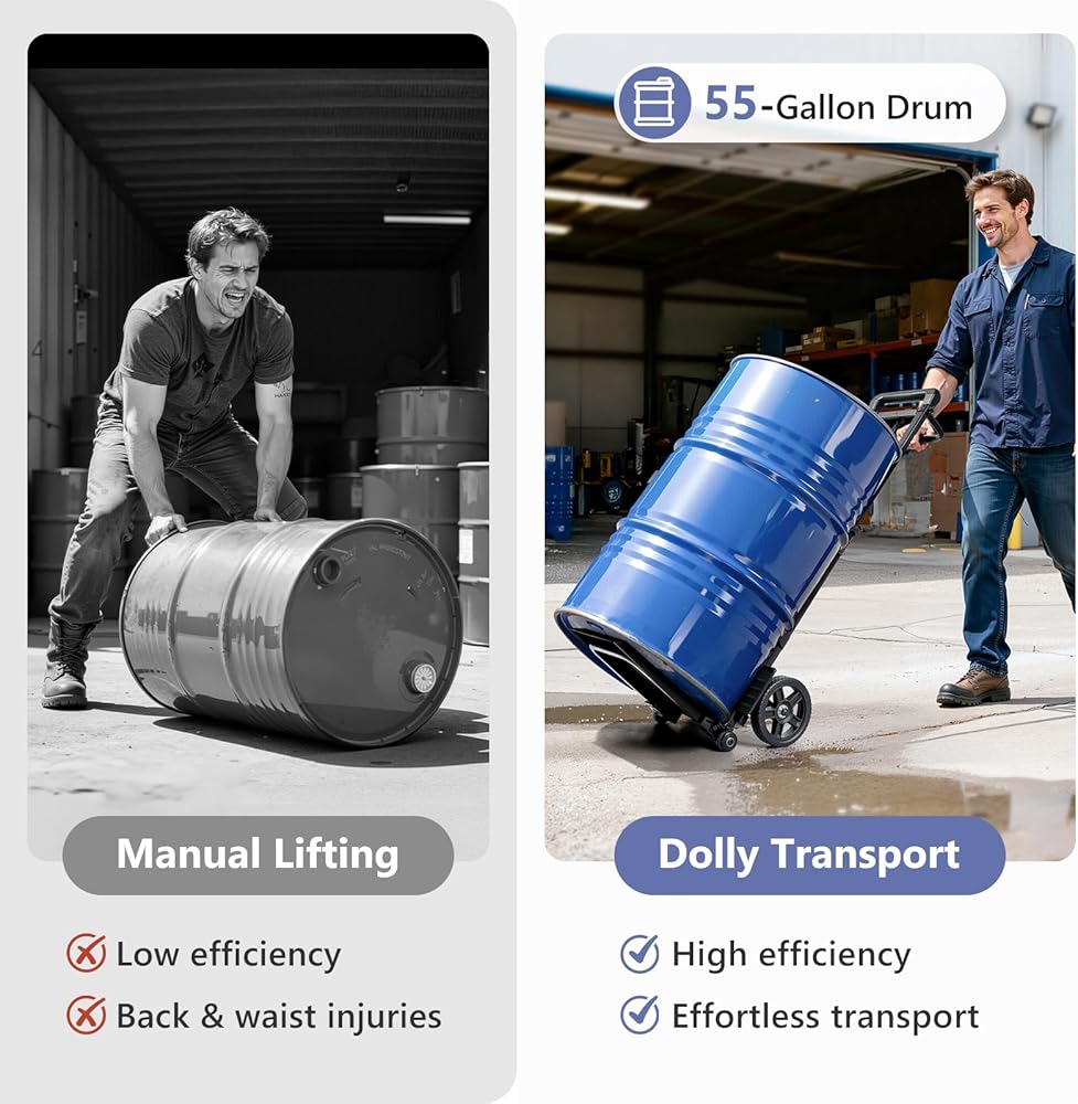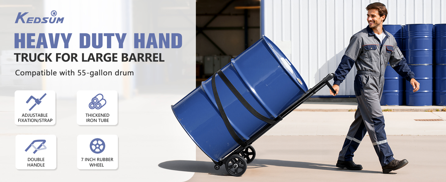 【4-Wheels & Max Height 47.2 inch】KEDSUM 55 Gallon drum dolly with 4 wheels let you easily transport heavy items. Our drum dolly boasts 6.9 inch rubber wheel×2 and training wheel×2, added stability and confidence when handling drum. The handle of drum dolly with wheels have 49.2 inches, which is very friendly to tall people. saying goodbye to the back pain caused by hunching over