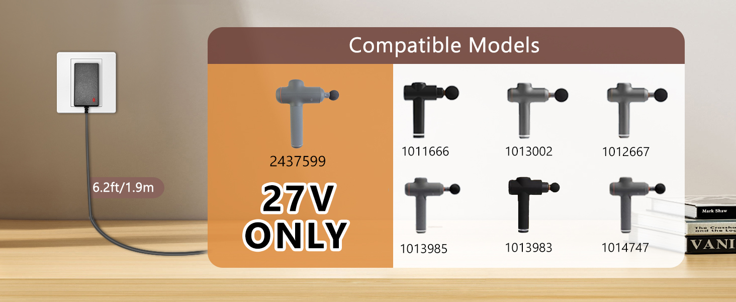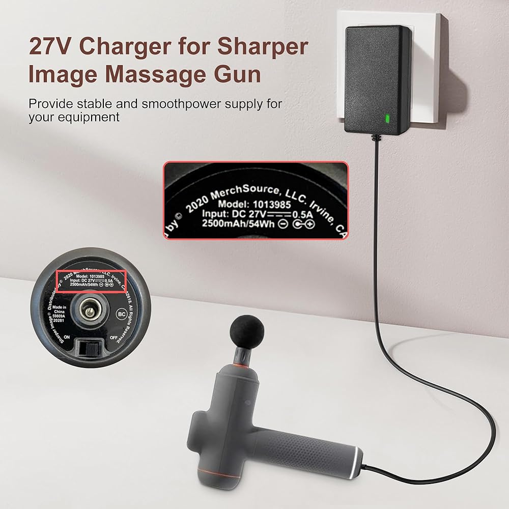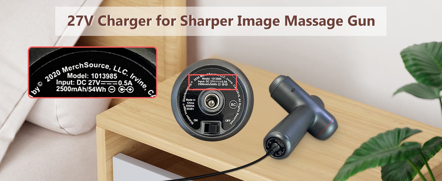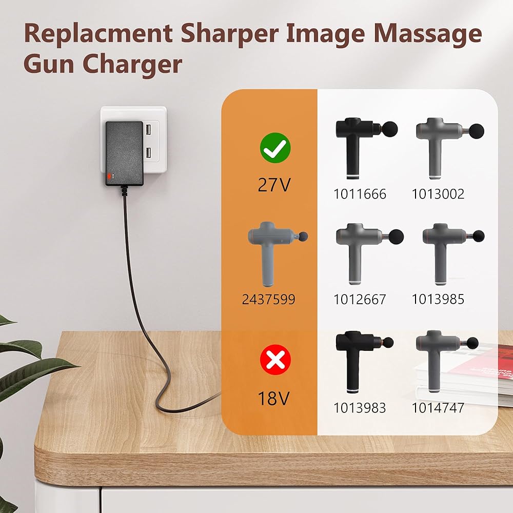 Compatible with: GnoTis Massage Gun Charger Compatible with Massage Gun Sharper Image 2437599 (only 27V) 1011666 1013002 1012667 1013983 1013985 2313786 2316222 1014747 1014392 Cordles Deep Tissue Massage Gun; ONLY Compatible with the Models Listed Above(NOT Fit for 18V Version)