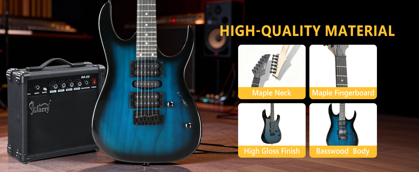 【HSH PICKUPS WITH 20W AMP, FLEXIBLE TONES】 Equipped with HSH pickups - two humbuckers and one single coil, this eletric guitar delivers clear highs and strong rock tones. The 20W electric guitar amplifier lets you adjust gain, bass, treble and volume for practice or small jam sessions.
