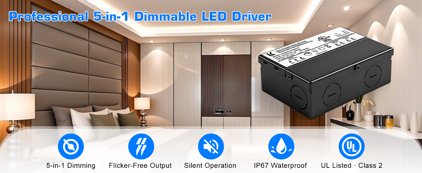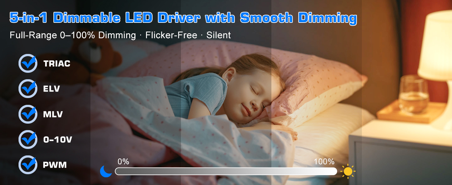 5-in-1 Dimmable LED Driver: This constant voltage LED transformer supports Triac, ELV, MLV, 0-10V, 1-10V, 10V PWM, and Potentiometer dimming, and is compatible with Lutron, Leviton, and most AC wall dimmers and control systems. It provides smooth, stable, full-range dimming from 0–100%, making it ideal for LED strips, modules, light bars, puck lights, under-cabinet lighting, recessed lights, signage, and other dimmable LED fixtures