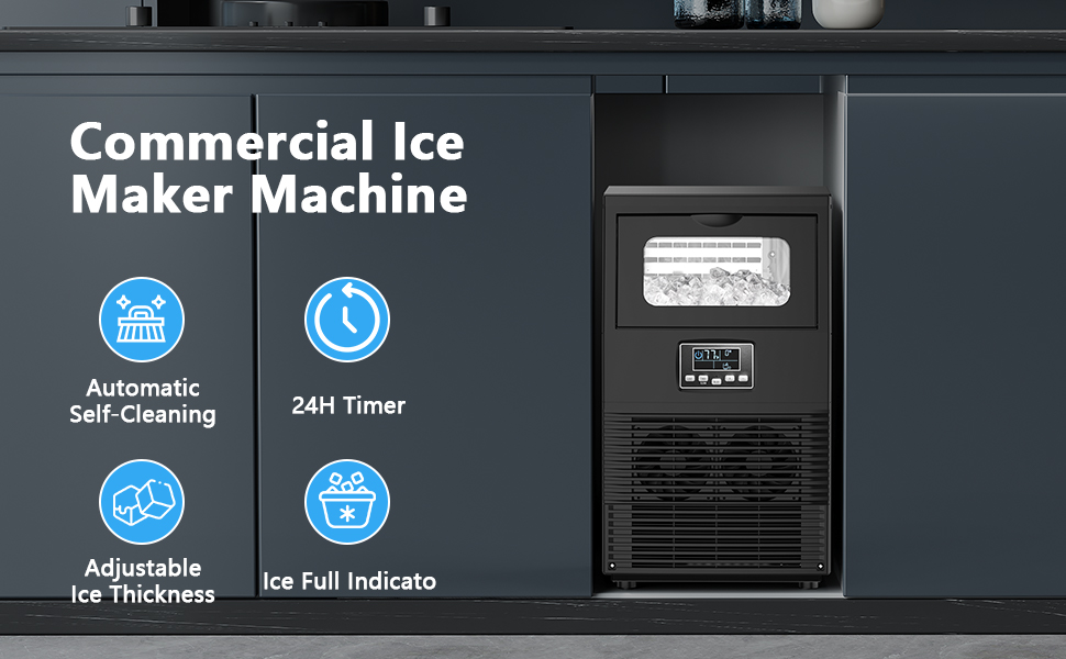 Smart LCD Control Panel: Equipped with an intuitive LCD control panel, the ice maker for commercial allows you to adjust ice making time for customizable ice cube thickness size(+/-), and features a 24-hour timer and one-touch self-cleaning function