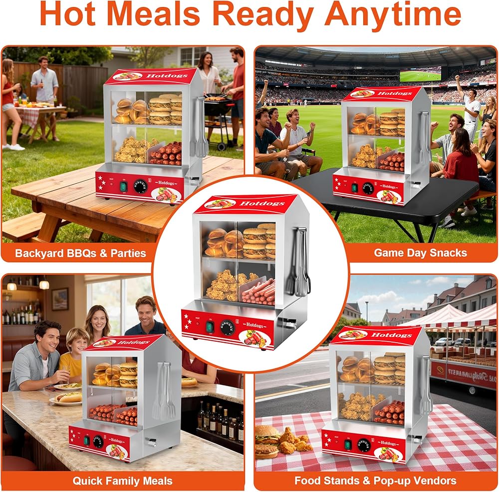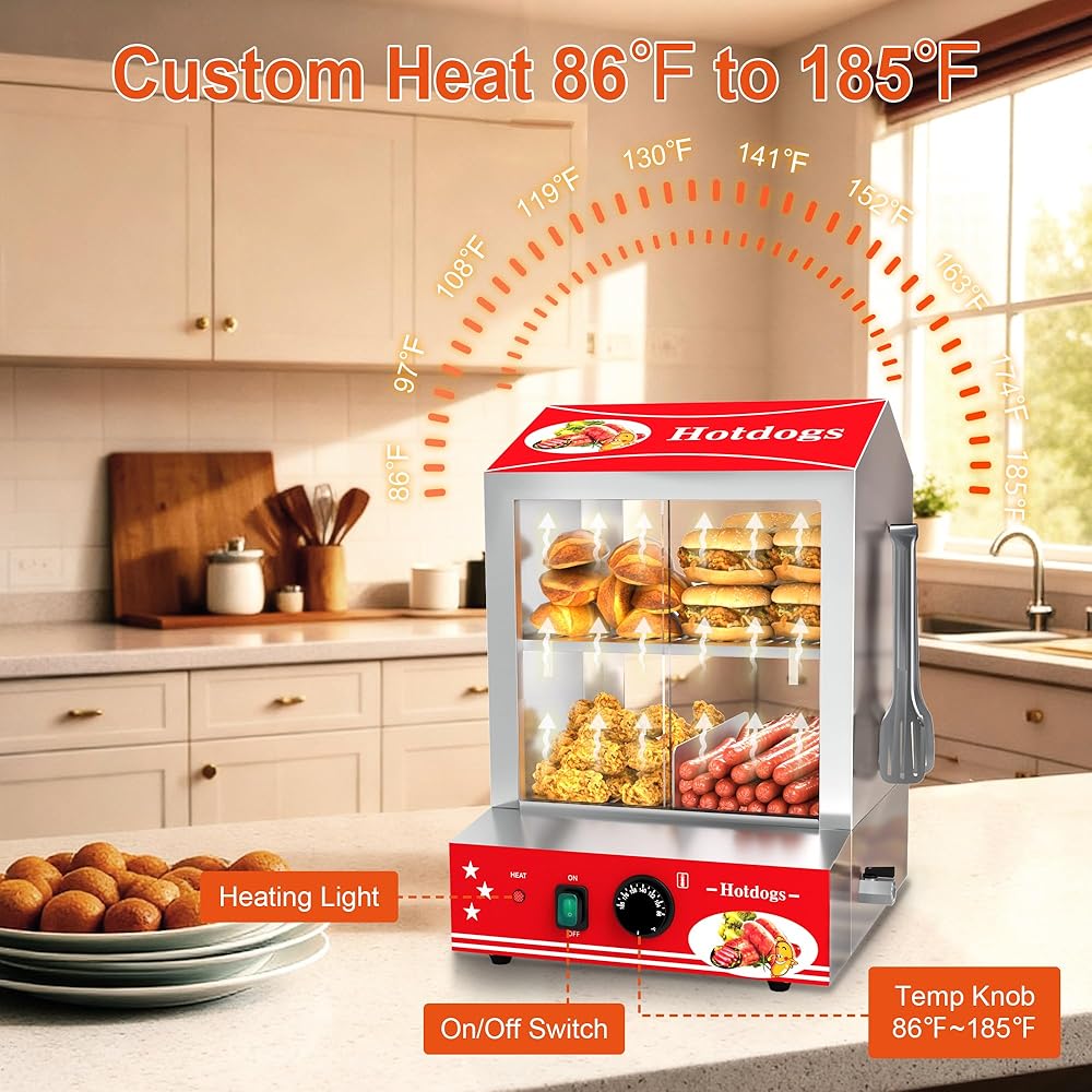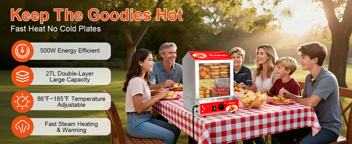 Fast Heating, Easy Control: With adjustable temperature from 86℉–185℉, you can warm food quickly and dial it in exactly where you want it. No guessing, no scorching, just steady, e ven heat that keeps hot dogs tasting fresh hour after hour.