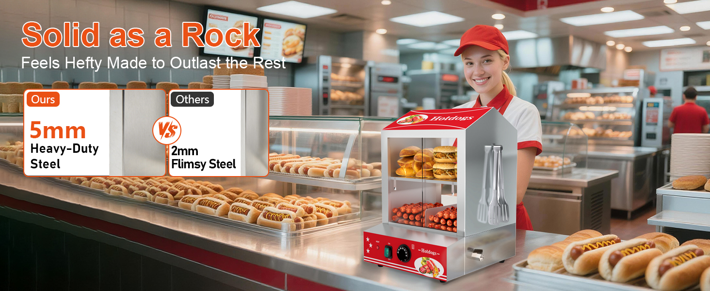 Durable Stainless Steel Build: Built with a stainless steel body, this hotdog machine is stable, easy to clean, and made to handle regular use. It holds up well over time, whether you're using it occasionally or putting it to work week after week.