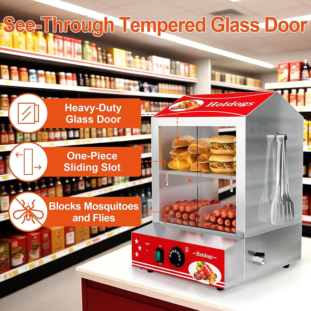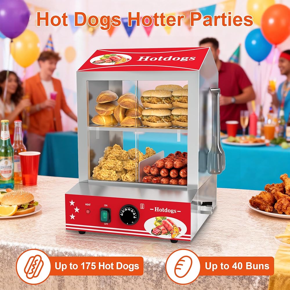 Big Double-Layer Capacity: The 28.5QT dual-layer design gives you room for up to 175 hot dogs and 40 buns at once. Great when you don't want to keep refilling or reheating, load it once and keep food ready as guests come and go.