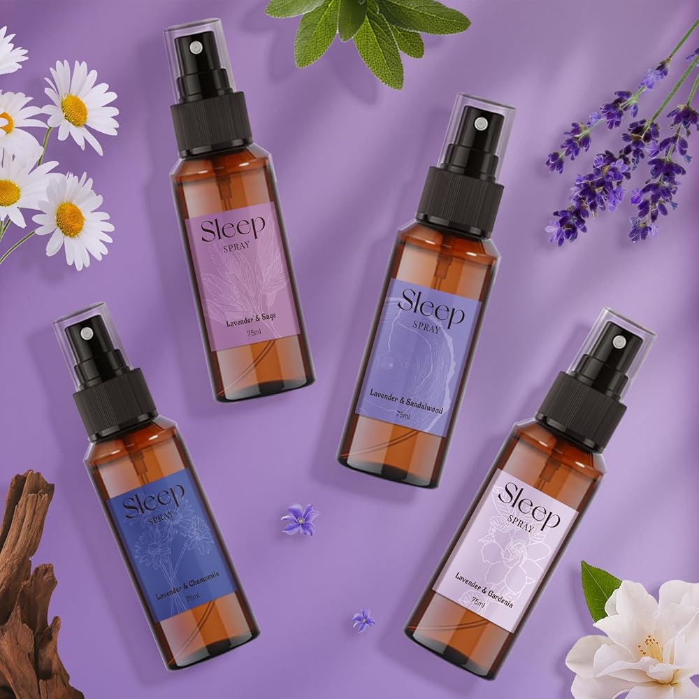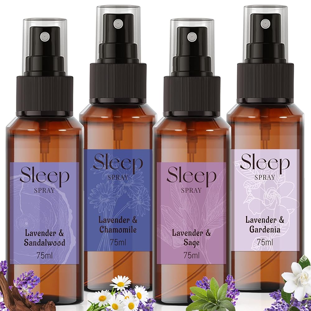 Four lavender Spray Scents: lavender & gardenia, lavender & sage, lavender & chamomile, lavender & Sandalwood. The sweet floral series features a lavender scent that helps improve sleep quality. Each bottle contains one fragrance. Each bottle is 75ML. There are a total of 4 bottles.