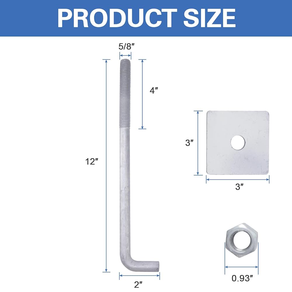 5/8" x 12" Concrete Anchor Bolts (10 Pack) L Shaped with Large Square Plate Washers, Hot-Dip Galvanized