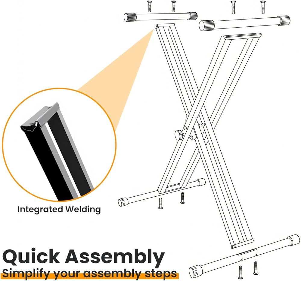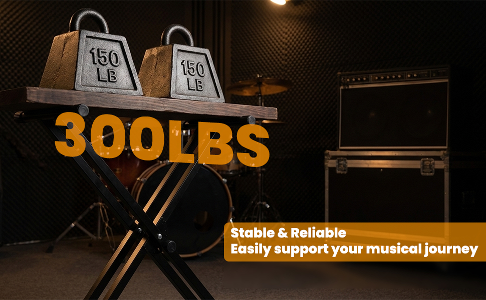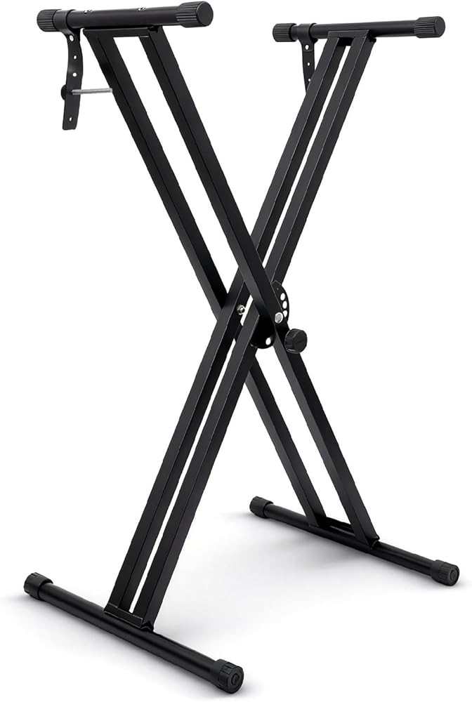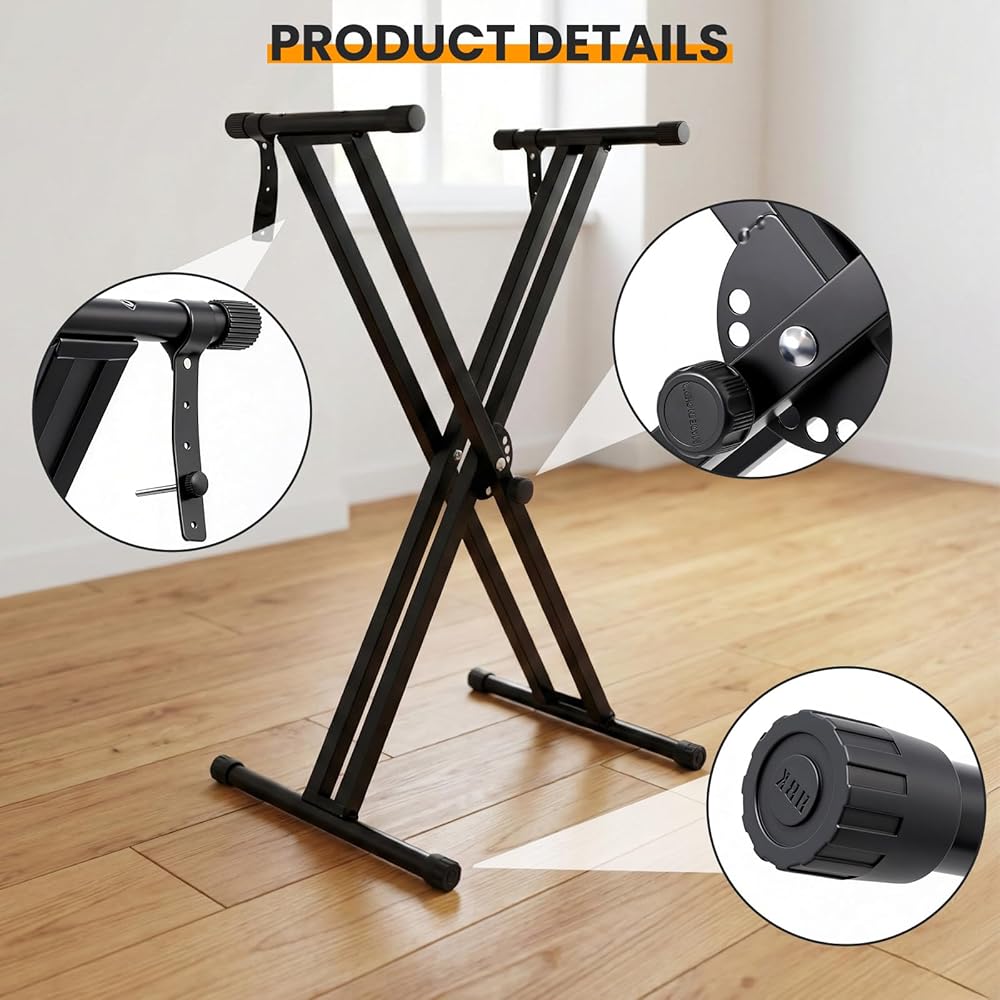 Rock-Solid Stability: Built with a heavy-duty double-X metal frame, this keyboard stand delivers exceptional durability and easily supports up to 300 lbs. It provides unwavering stability and security for your digital piano or keyboard. Extended leg tubes offer a wider, steadier base, while non-slip rubber feet and a secure locking strap keep your instrument firmly in place.