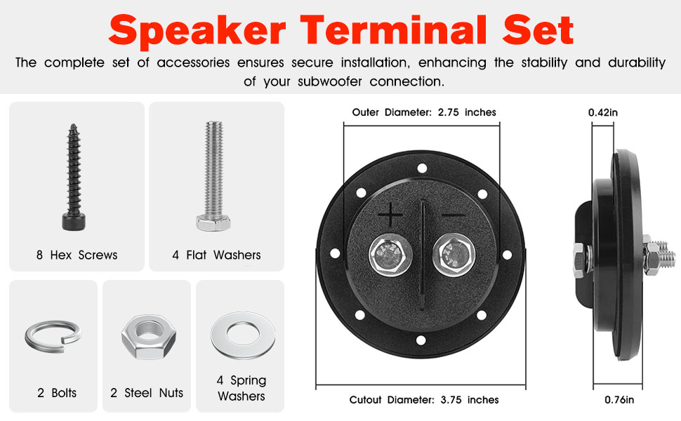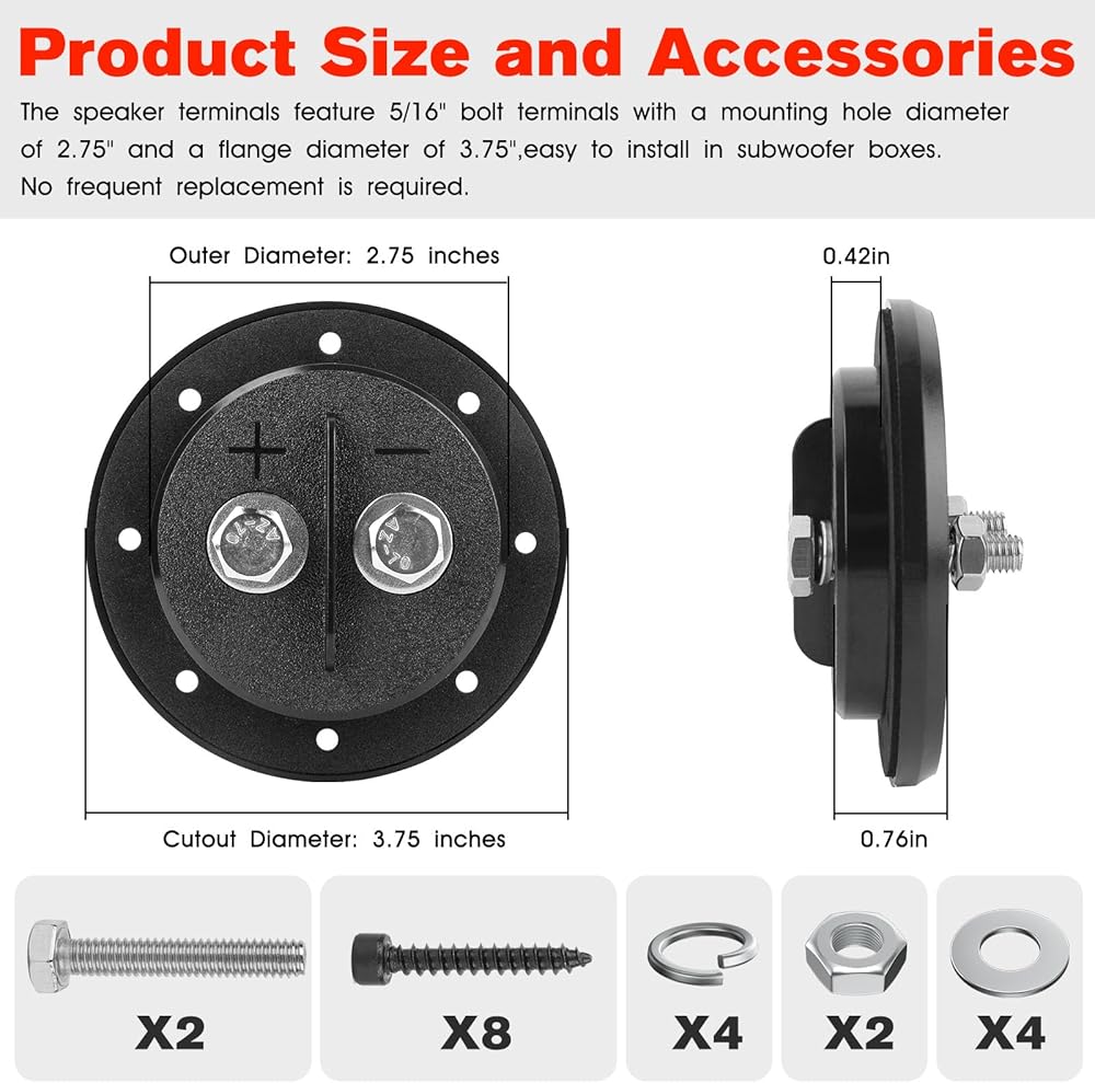 Speaker Terminal Size: The speaker terminal features a 5/16" bolt terminal, cutout diameter is 2.75 inches and the flange diameter is 3.75 inches for easy installation in subwoofer boxes. No frequent replacements needed.