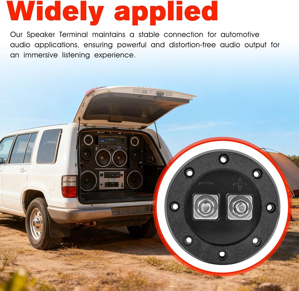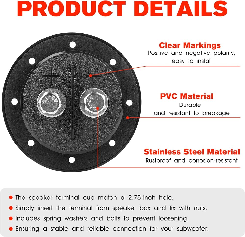 Subwoofer Terminal Connector: Equipped with stainless steel subwoofer terminal connectors, this terminal cup is rust-proof and corrosion-resistant. It maintains stable connections for car audio applications, guaranteeing powerful and undistorted audio output for an immersive listening experience.