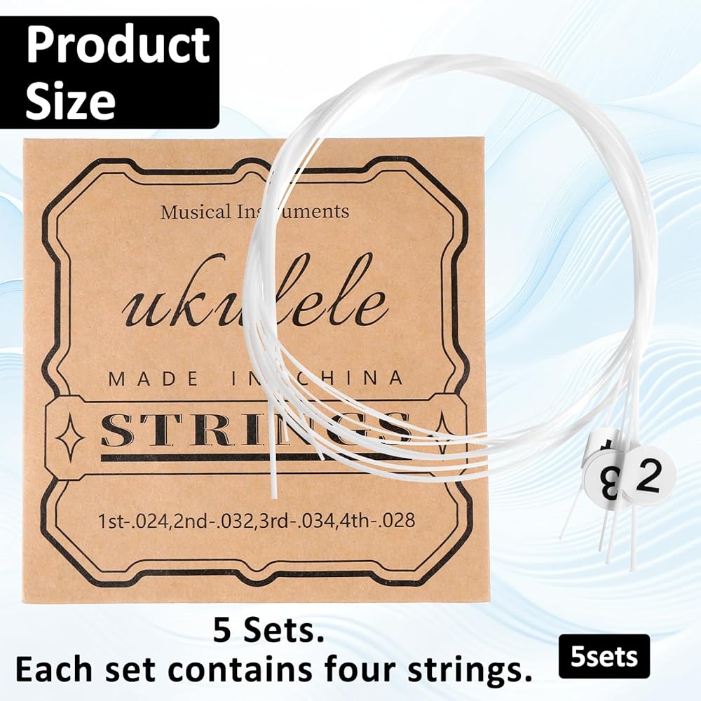 Premium Nylon Strings: Made of nylon, these ukulele accessories have a smooth surface, stable tone, and a warm, clear sound. They are durable, long-lasting, and wear-resistant, balancing durability and playability, reducing the need for frequent string changes. The strings are marked with numbers 1, 2, 3, and 4 for easy identification