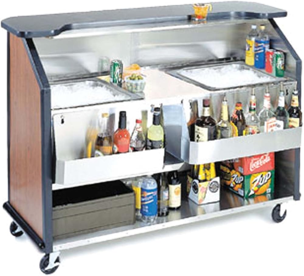 Portable Bar, 63-7/8"W x 27-1/2"D x 46-1/2"H, waterproof top, laminate over stainless steel exterior, stainless steel work shelf and inner cabinet, (2) insulated ice bins with drain: 40 lb capacity each, (2) 7 bottle speed rails, 5" casters (2 fixed, 2 swivel with brakes) (by Lakeside), Made in USA.