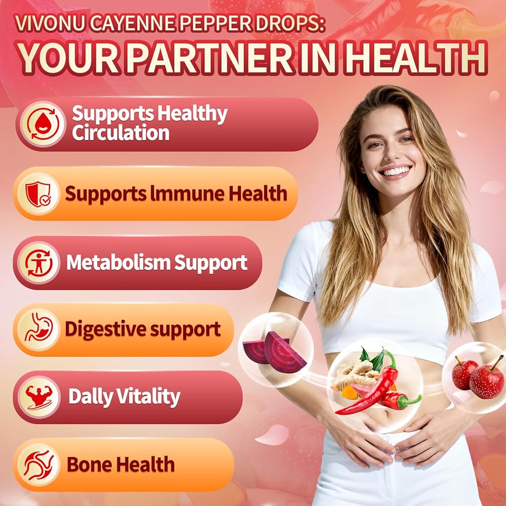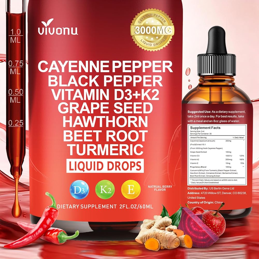 VIVONU Intense cayenne pepper Complex Supplement】 Featuring cayenne pepper supplements, hawthorn berry capsules in liquid drop, organic beets, turmeric liquid supplement, vitamin D3 K2, ginseng root, Ceylon cinnamon supplement, and berberine liquid drops, this comprehensive blend brings together high-quality botanicals for everyday wellness, Cayenne pepper drops supports overall vitality, digestion and gut health. gut health. Ensuring your circulatory function, contributing to a well-balanced and energized body