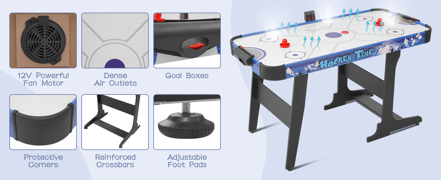【Powerful Motor】Featuring a robust 12V blower motor, this 58-inch air hockey table ensures consistent and stable airflow across the entire surface. This significantly reduces puck friction, delivering a fast and seamless gaming experience reminiscent of arcade-quality play. The updated style and modern color scheme allow it to blend seamlessly with any game room decor.