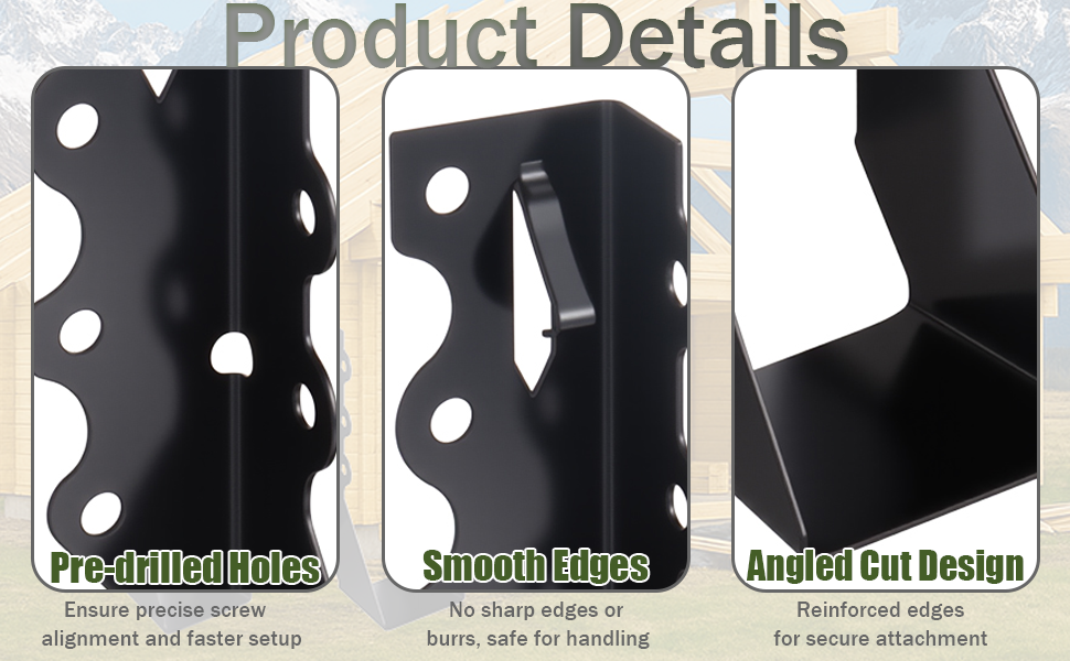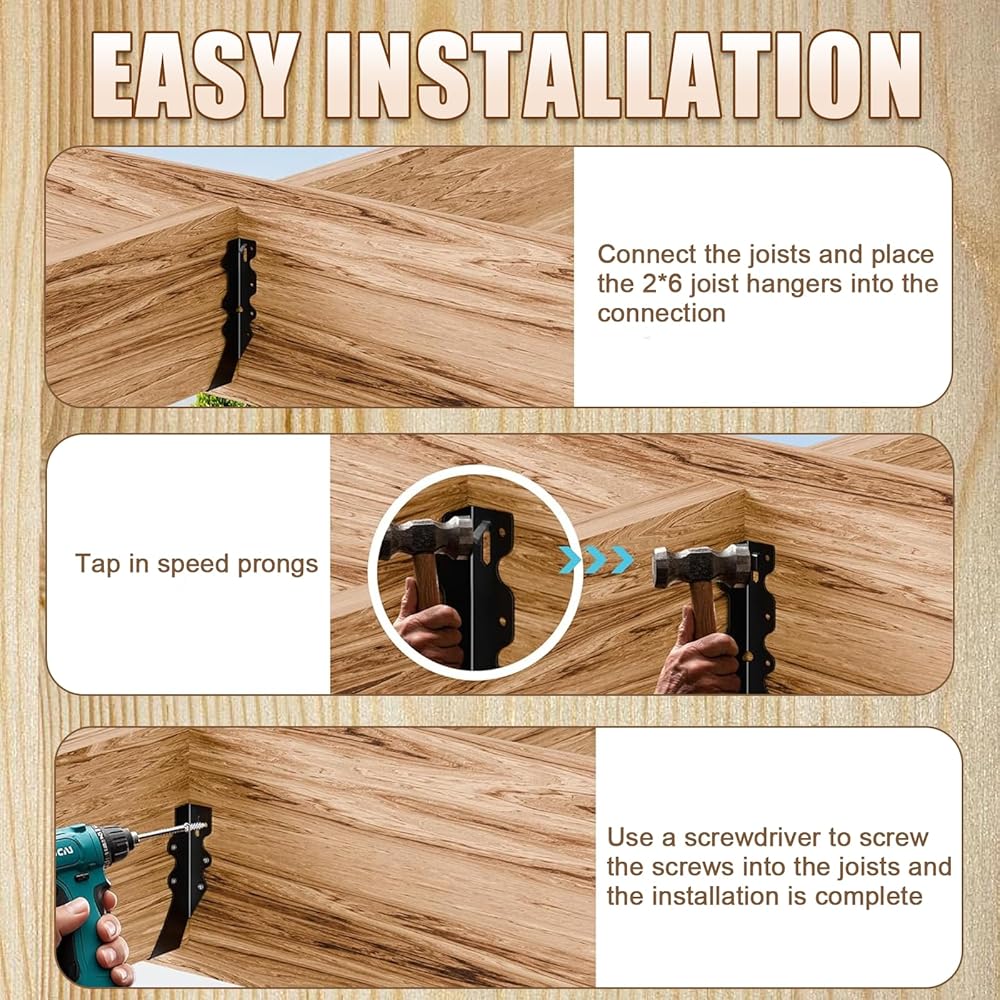 【Easy Installation】Our joist hangers are added with temporary fixing claws, first put the wood ties into the joist hangers to choose the right position, knock down the temporary fixing claws, and then fix it with screws, then you can fix and install the hurricane ties easily and quickly.