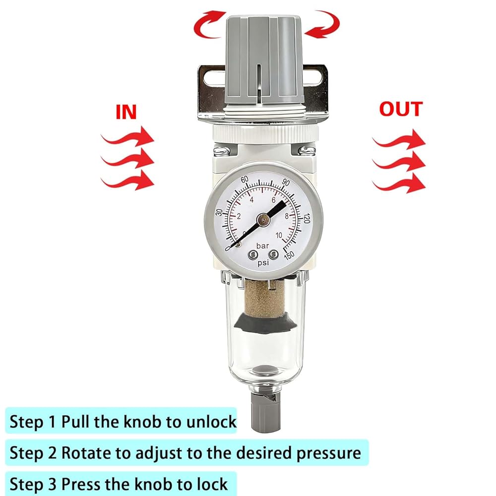 Specification:Regulator Port Size:1/4" NPT; Gauge Port Size: 1/8"NPT;Working Pressure:0-145PSI;Working Temperature:41~140°F;Flow Rate:20 SCFM(550L/Minute)@90 psi