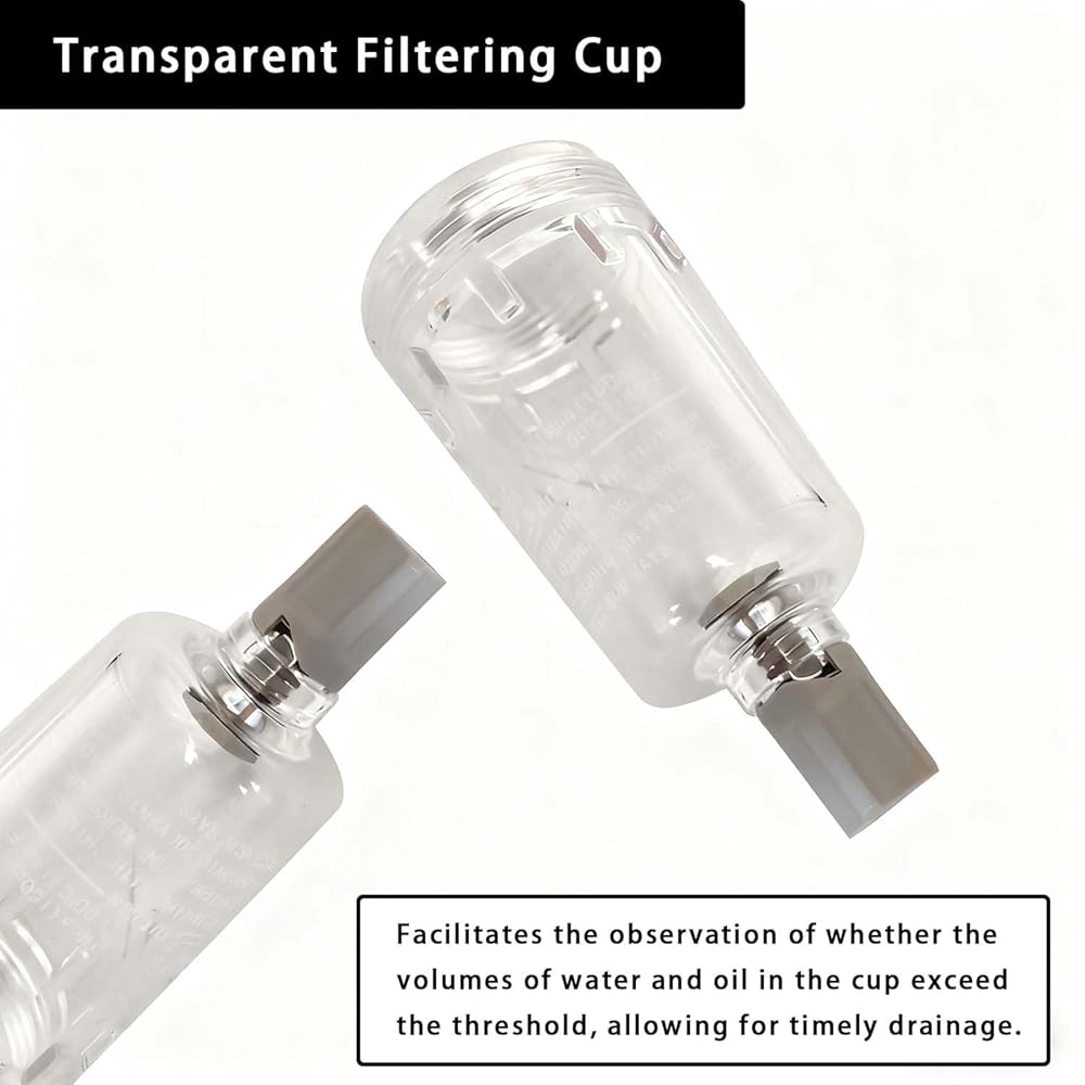 Pressure Gauge & Filter Cup: The metal-cased pressure gauge is more durable, with both bar and psi scales; the transparent filter cup allows observation of water and oil levels, enabling timely drainage