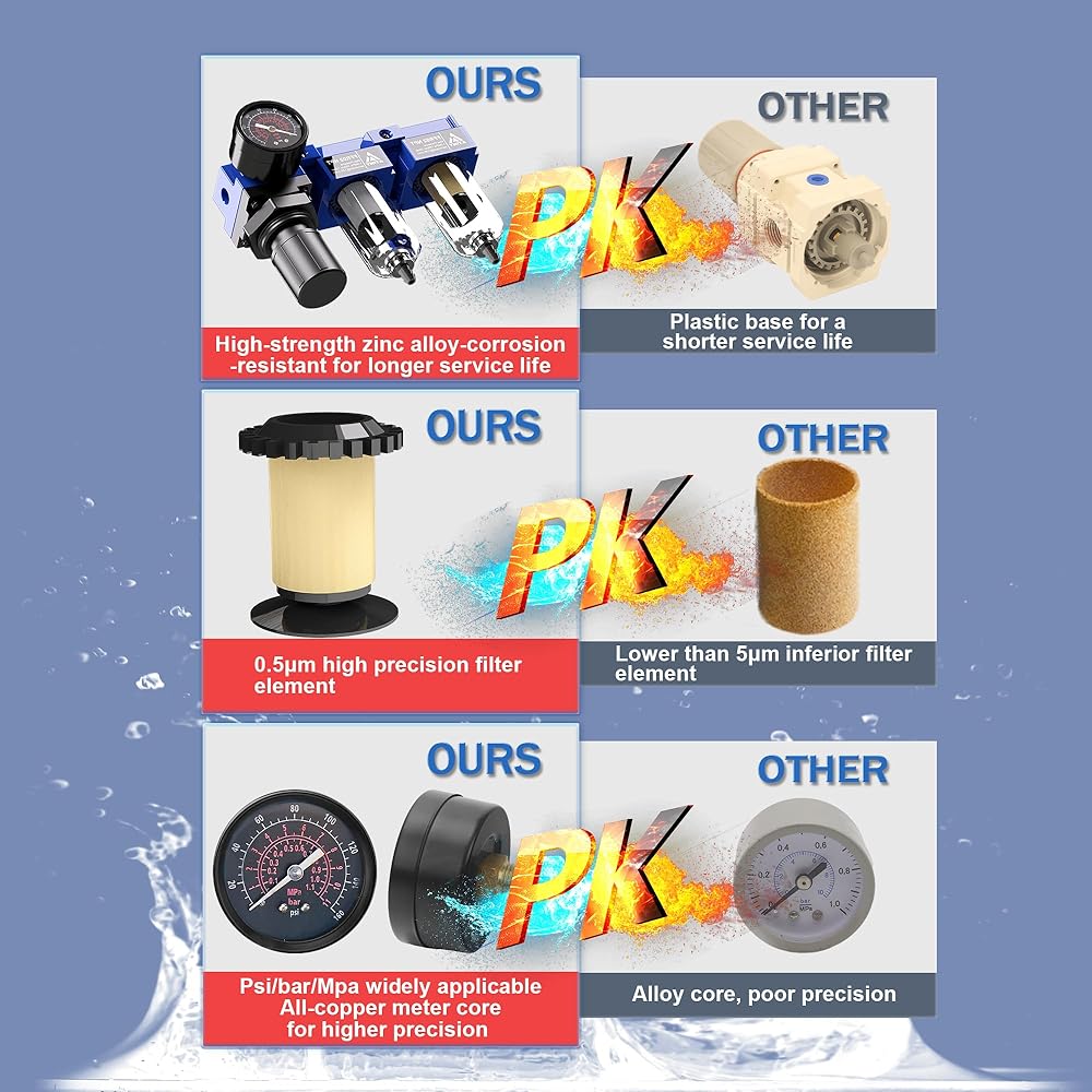 【Caution】Operate within a maximum pressure of 1.0MPA/150psi/10bar. Exceeding this limit may damage the air filter regulator.