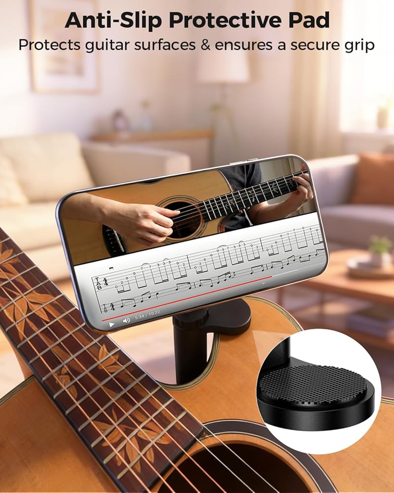 Scratch-Free Stable Grip: Your guitar's finish is safe with us. The soft rubber pads inside the clamp act as a cushion to absorb vibration. This design prevents scratches and ensures your video recordings remain stable and jitter-free.