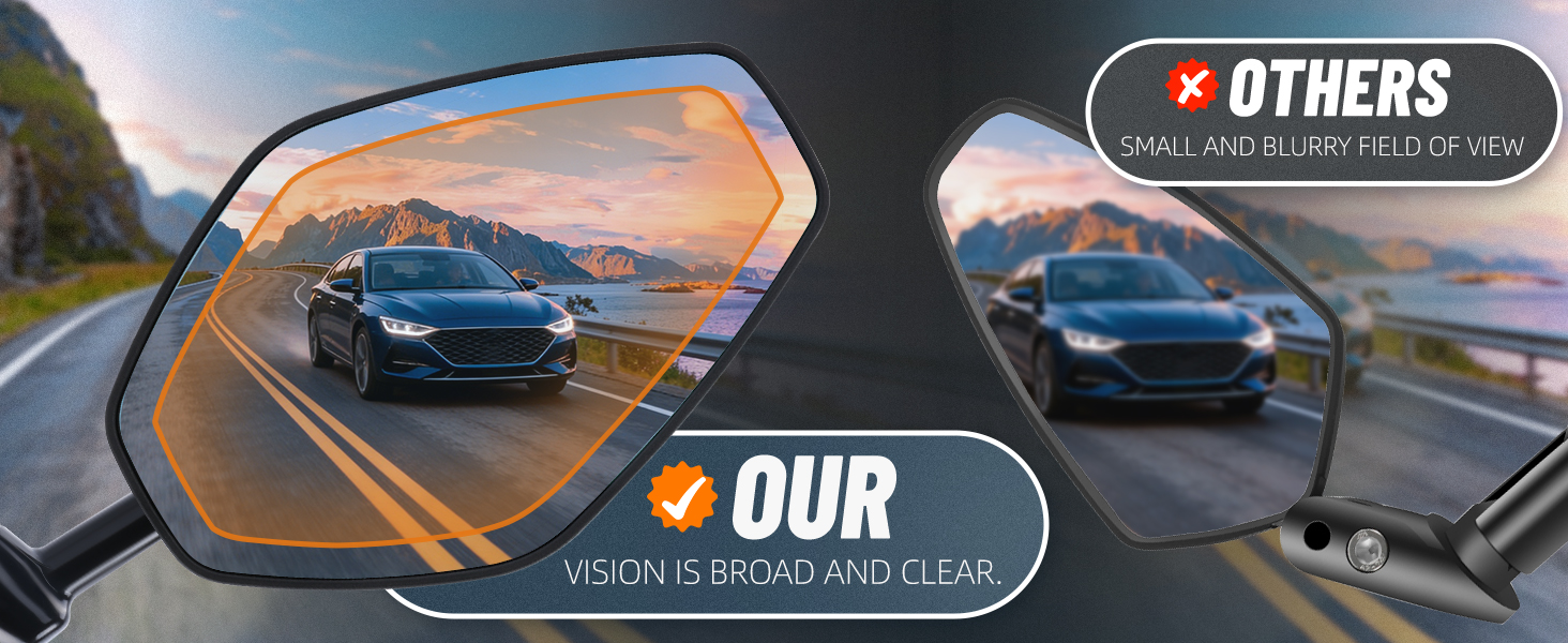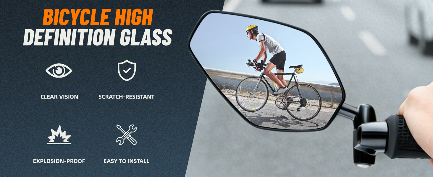 【PREMIUM QUALITY MIRROR】Our bicycle mirrors feature automotive-grade high-definition glass for crystal-clear vision and an expanded field of view. The mirror housing is crafted from high-hardness PA material, while the mounting stem is made from durable aluminium alloy. This premium rear-view mirror ensures your cycling safety.