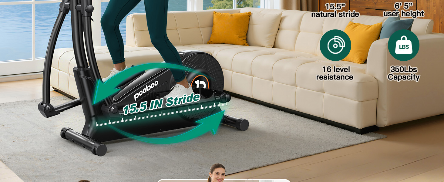 【Ultra-Quiet Magnetic Rear Drive System】The pooboo elliptical trainer features a fluid, natural motion powered by a whisper-quiet magnetic drive. Its rear-drive design, paired with a robust 16 lb flywheel, shifts the center of gravity backward for enhanced safety and stability during exercise. Whether striding forward or reversing, the system operates at just 20 dB—so your workouts remain peaceful and disturbance-free, allowing you to focus fully on your routine without waking the household.