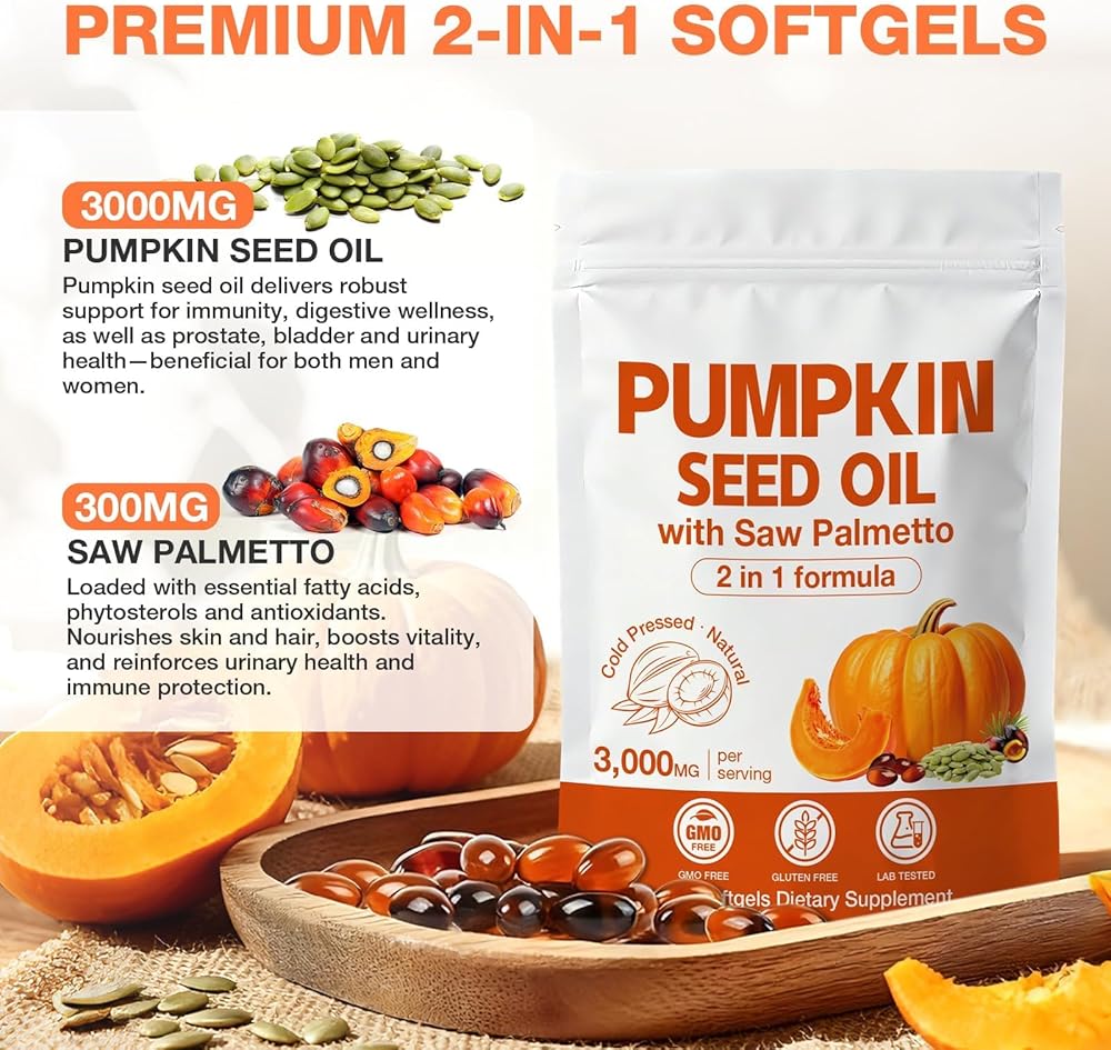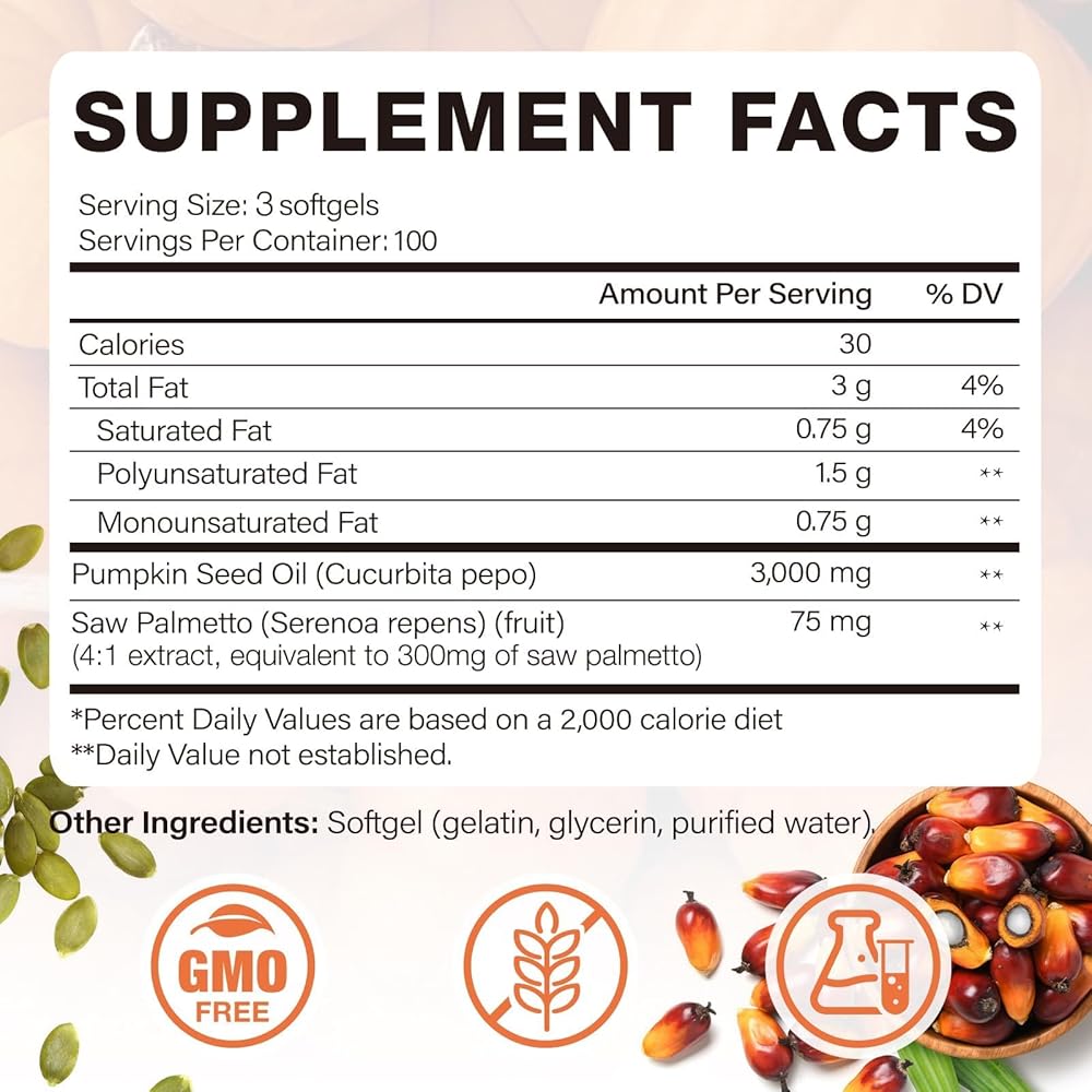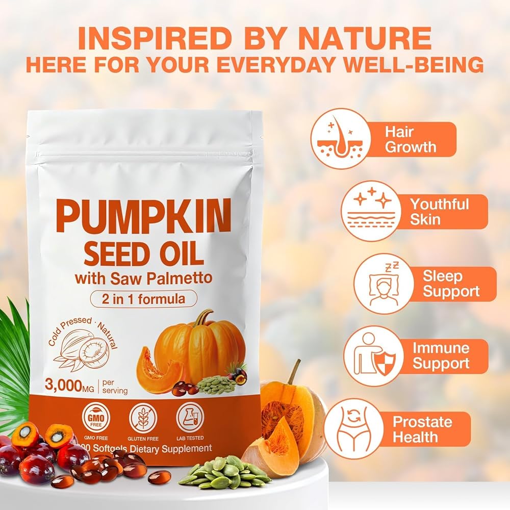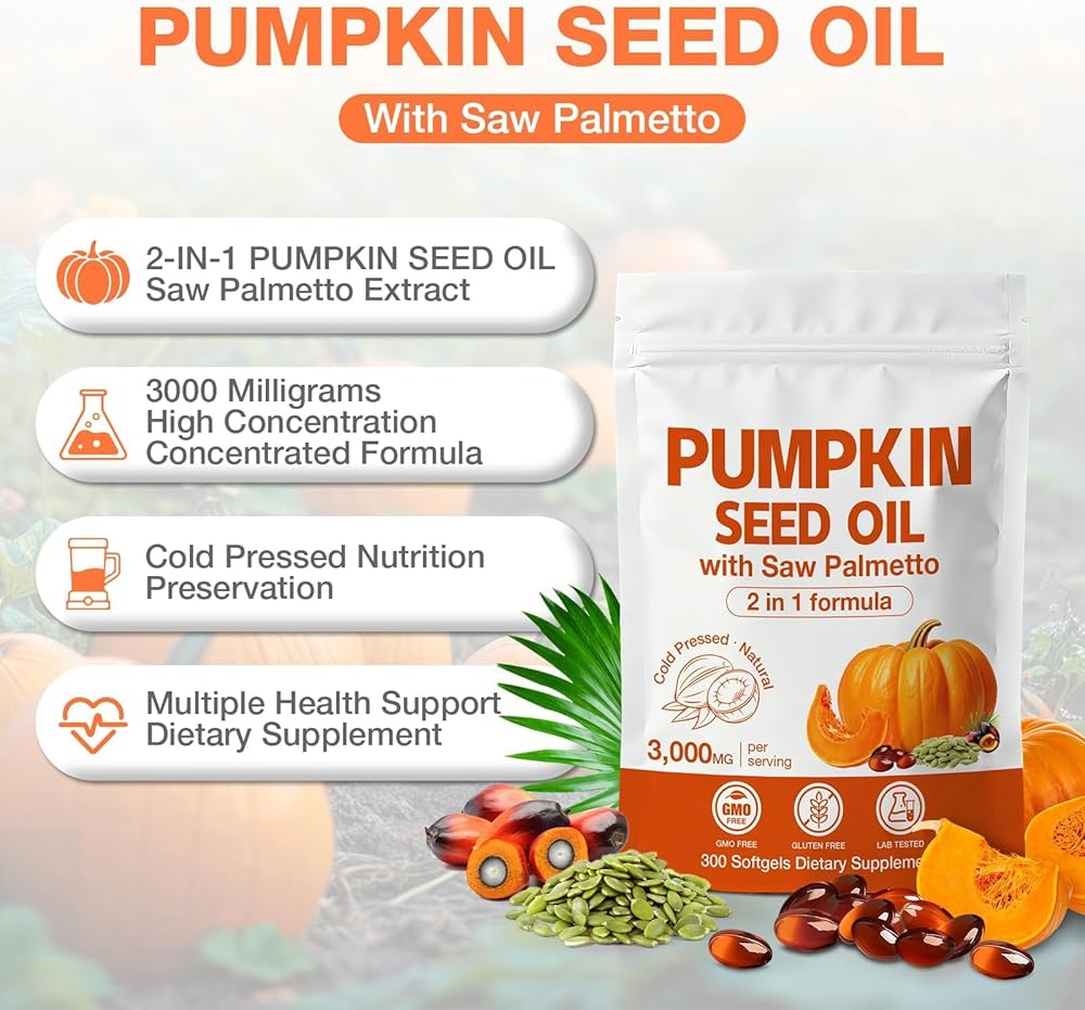 زيت بذور اليقطين مع كبسولات بالميتو المنشارية 300 كبسولة هلامية - 3000 مجم أقصى قوة، معصور على البارد، يدعم صحة الشعر والمسالك البولية والمثانة والبروستاتا، ويعزز المناعة، وغير معدل وراثيًا