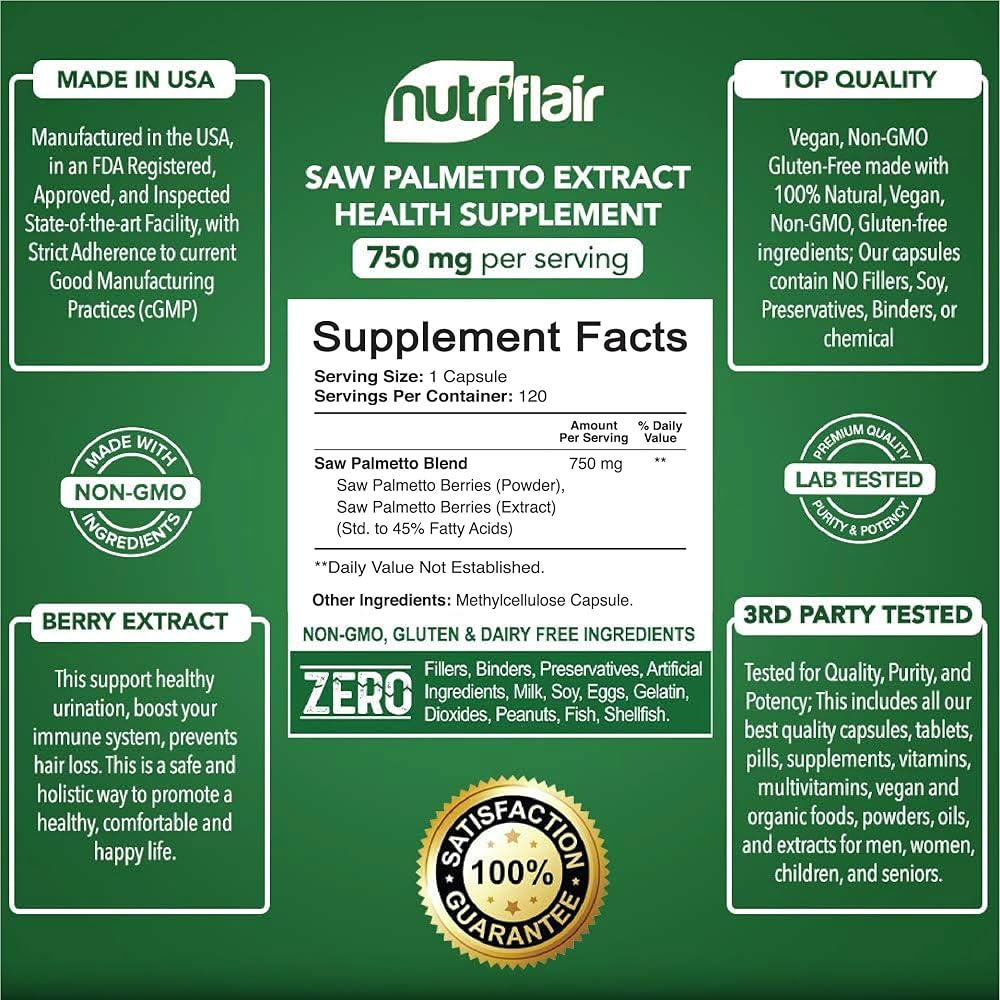 • ✔️ Trusted Brand, Quality & Satisfaction Assured: If our non-GMO saw palmetto extract pills do not bring noticeable value to you and you don't absolutely love them, your purchase is on us; no questions asked. Our world-class customer service wants you to be satisfied with your purchase. Absolutely no risk. The bottle comes with the NutriFlair Satisfaction Pledge for 30 days. Have this all-mighty prostate support formula by your side today and get rid of the undesired.