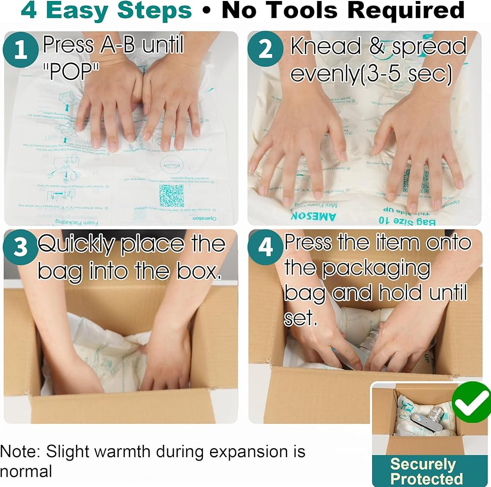 Simple 4-Step Operation – Squeeze the liquid from Area A to B → Rub the pack firmly until warm and expanded → Spread the foam evenly inside your box → Place your item on top and let the foam fully conform.