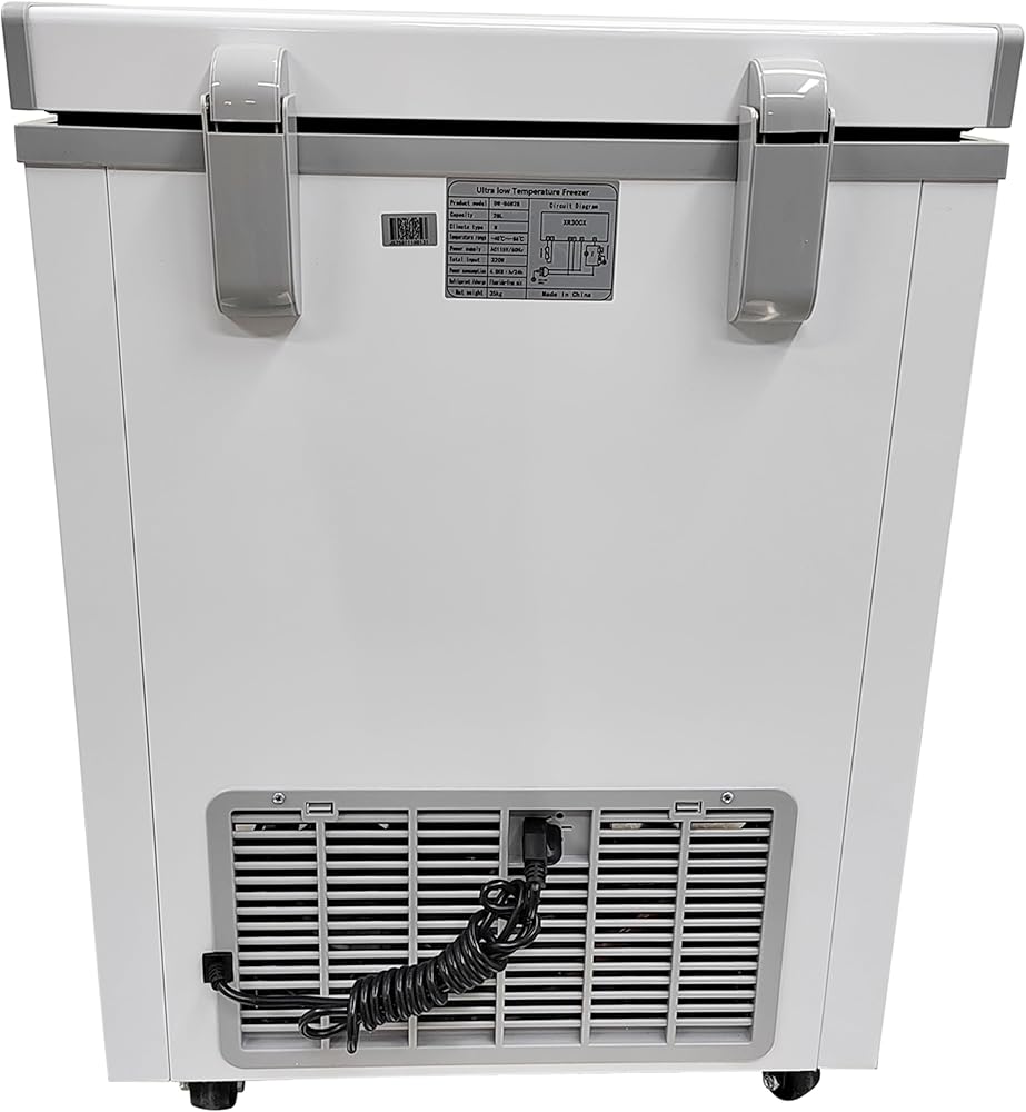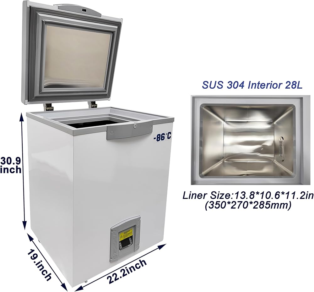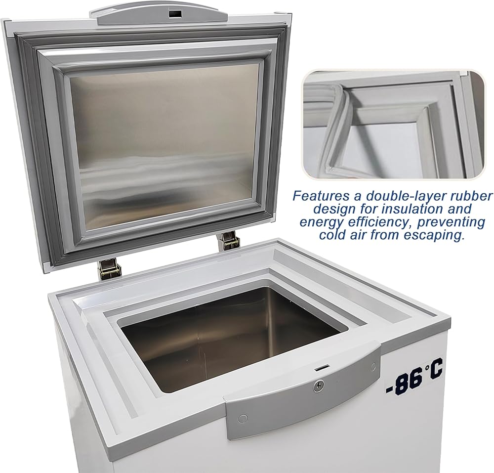 [Ultra-low Temp Freezer] The temperature range is -40°F to -122°F (-40℃ to -86℃) with a silicone double-sealed door to ensure excellent insulation and seal integrity. Offers superior performance with strong refrigeration, fast cooling, and energy efficiency, functioning reliably even at 109.4°F(+43℃) ambient temperature.